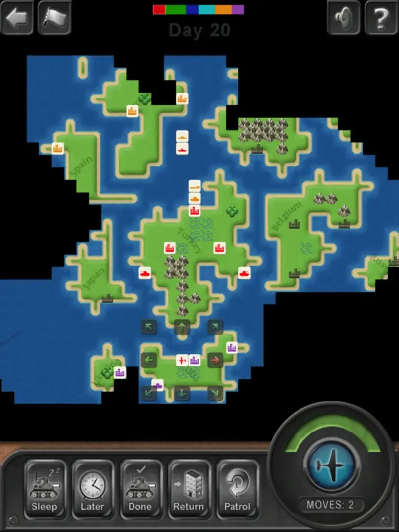 Conquer the world starting from your single home city. Each city can build units (either tanks, planes, paratroopers, bombers, transports, destroyers, battleships, submarines or aircraft carriers) in order to explore the world and defeat the other five AI controlled enemy players. There's a lot of AI in the computer's moves and the maps are randomly generated, so each game is interesting and challenging.