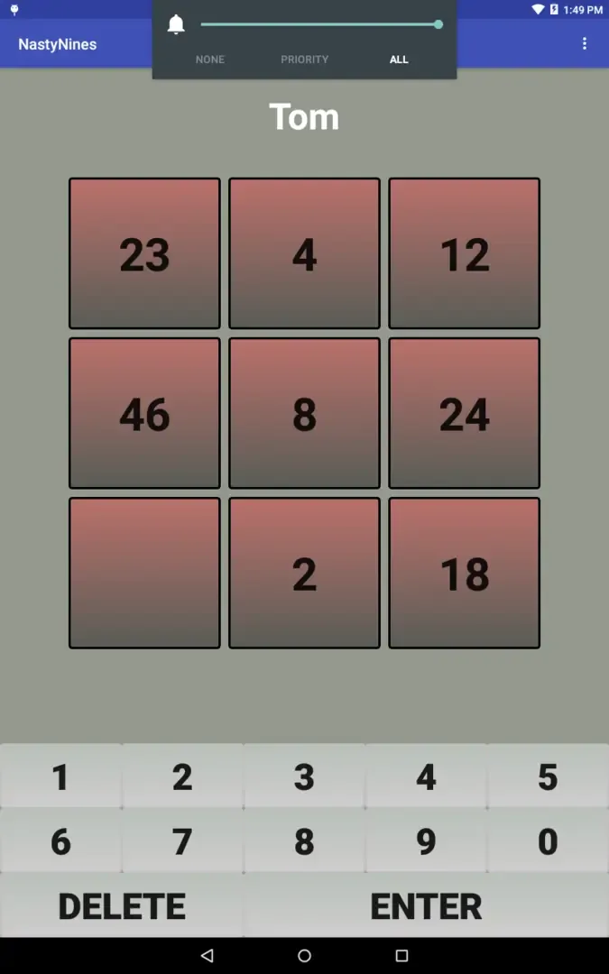 Nasty Nines is a number puzzle. It is a cube of nine squares. Numbers are inserted in some of the squares. To solve the puzzle, you must fill in the remaining squares. To determine what numbers to insert, you must follow the pattern set by the numbers given.