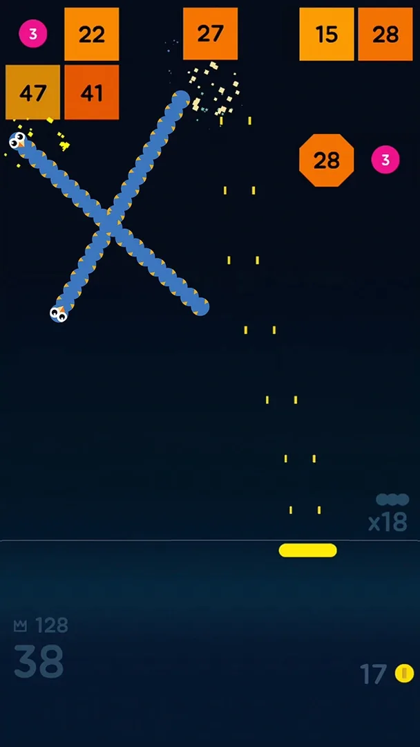 Swipe left and right, manipulate the baffle, bounce a snake consisting of small balls, and constantly bounce and hit the bricks! As the bricks fall, try to adjust the angle, collect more balls, let the snake grow longer and break all the bricks!