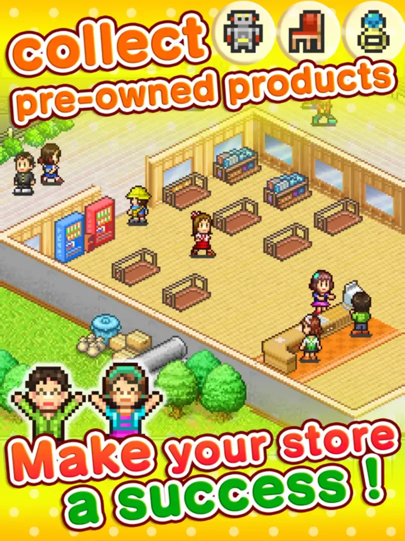 Become the manager of a pre-loved goods store (yup, that's just a fancy name for second-hand!) and turn it into a prospering business! There are many towns for you to operate in, each with a unique customer base and different products for you to discover. You can guess what you'll find in Trendy Town or Totaltoys District, for example! The product line-up at your store is up to you, of course. Will you be selling model toys, video games, classy suits, cars, plasma TVs, or diamonds? That's the fun in the second-hand retail industry - you sell all sorts of goods, cherry-picked from a variety of available pre-owned products. Your store also offers a gift-wrapping service which does wonders for boosting customer satisfaction. Besides store shelves, you can also have stalls selling donuts or ice-cream, a gaming corner or toy vending machine. They'll draw in more customers, and once your store becomes really popular, even whole groups of kids or curious tourists. Your field staff are in charge of collecting goods for sale. They'll sometimes come across what looks like real treasure, but you'll have to appraise it first to see what it's actually worth. You may discover some amazing items this way, which will bring fame to your store! Fully exploring every town and finding all available products is a real challenge... Are you up for it?