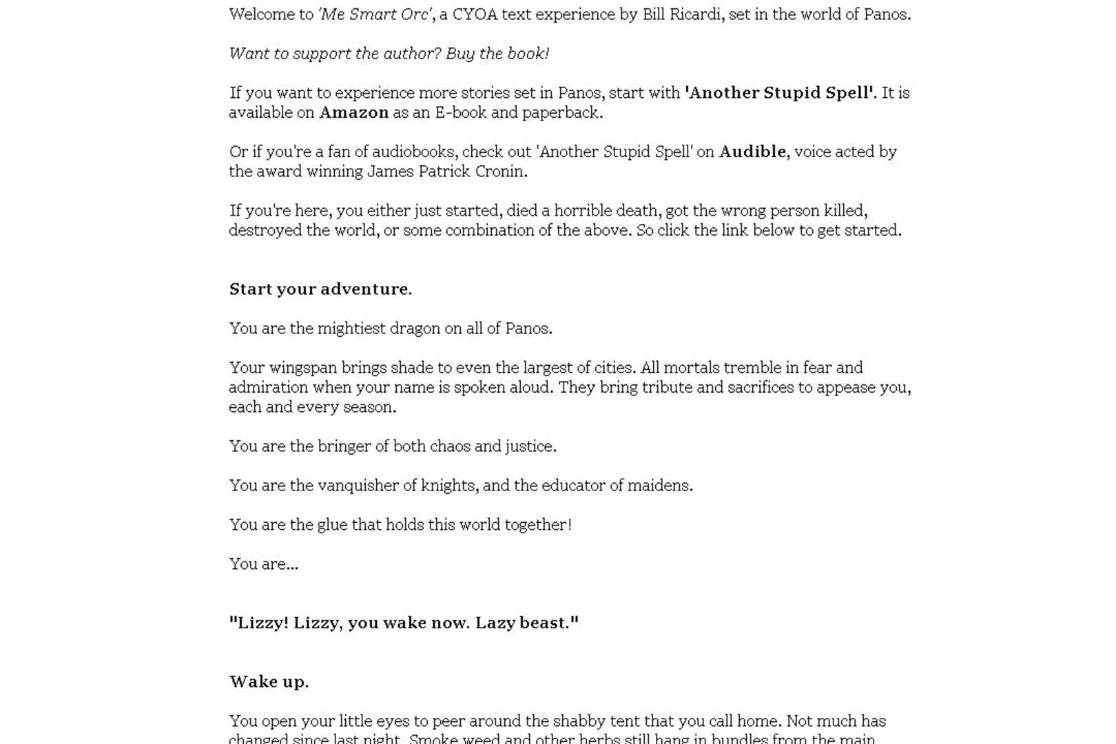 Me Smart Orc is a short Choose Your Own Adventure (CYOA) text game, set in the world of Panos. You play Lizzy, the flying lizard. Your master has tasked you with protecting Dunwart, a pain-in-the-butt apprentice mage who gets dumber every time he casts a spell. Good luck, you'll need it!
