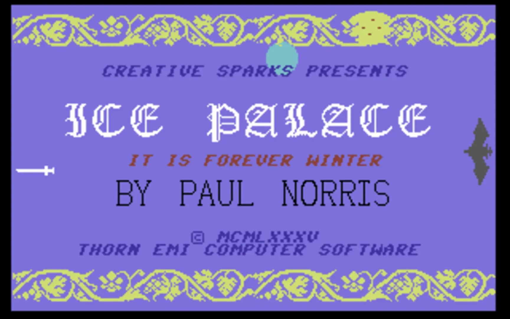 You are on a quest to retrieve your dead Father's crown to help you destroy the evil Ice Queen and remove eternal darkness from your land. You must navigate around her Ice Palace to find the seven pieces of the crown over seven levels to succeed in your quest using objects to solve puzzles. The game is an arcade adventure and contains two screens, the Action Screen or the Adventure Screen. The Action Screen is viewed from above showing a part of the level on the screen. Each level is made up of Hexagon shaped rooms with various objects inside to help or hinder you in your quest. There are six types of rooms and these are empty, a lake which cannot be crossed, a sword which contains various items, a fire which replenishes your firestick, ice which is difficult to cross and a black moline which cannot be entered. Each room has has various entrances and each room can be rotated to align entrances. As you explore the Palace there are various waves of creatures which when touched moves a gauge from good to evil and when it reaches evil it is game over. You can destroy these creatures with your firestick and once a wave is defeated then a spinning cylinder appears and when touched increases your gauge to good. The adventure screen has text and allows you to interact with objects found and solve puzzles. You can also see how many pieces of the crown are found, your good/evil gauge, indicator of any nasties in the area and a candle showing how much time you have left.