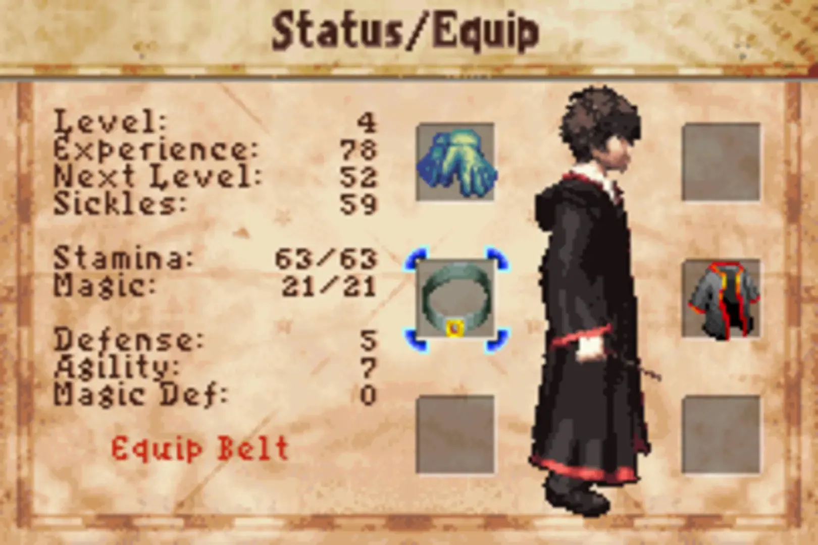 Harry Potter and the Prisoner of Azkaban is the third Harry Potter game for the Game Boy Advance. It is the sequel to Harry Potter and the Chamber of Secrets for the Game Boy Color, and as such, features similar turn-based RPG gameplay with additional puzzle elements. In turn-based battles, Harry and his friends must use the right spells and items to defeat their enemies. Outside of battles, you will take on quests and explore various dungeons. Inside dungeons, enemies are visible, so that it is possible to avoid combat. You will also need to use different spells to solve puzzles and clear obstacles.