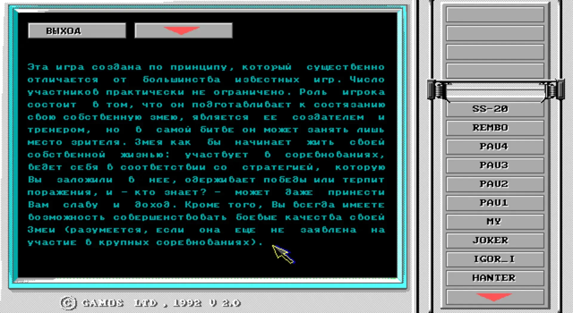 Snake Battle is a programming game where the player trains his own snake to participate in the snake battle matches. Each snake can have own color, programmed AI, and it is password-protected. Training is concluded in pre-defining the nine schemes of possible snake behaviours on the battlefield. The player does not control the snake directly. Each match requires up to four snakes on the battlefield, and the goal of each snake is to eat the tail of another snake. With each eaten tail the snake is increased, and the snake without tail is reduced. The winner of the match is a snake with a greater length. The game was released only in Russia.