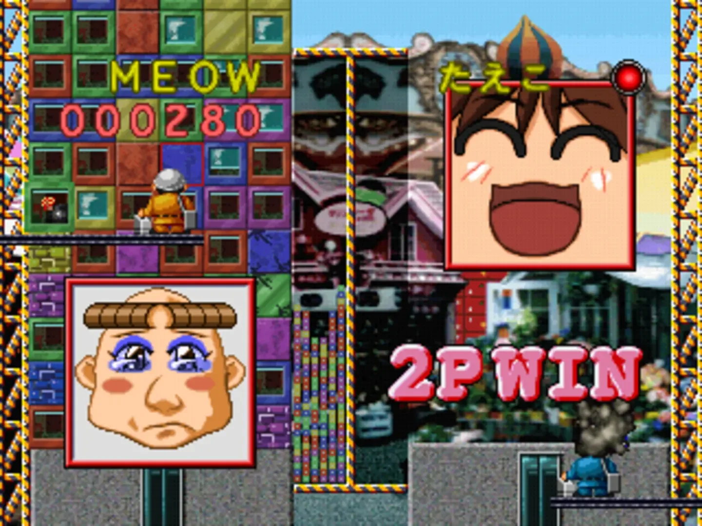 Building Crush! is a puzzle game where you play the role of a demolitions expert and try to bring down buildings faster than your opponent. Place bombs in windowed blocks to clear connected blocks of the same color, and make chains with the falling blocks that match up. There are several bomb power-ups to increase their effectiveness, as well as assist characters to hinder your opponent. You can play against the CPU or a friend.