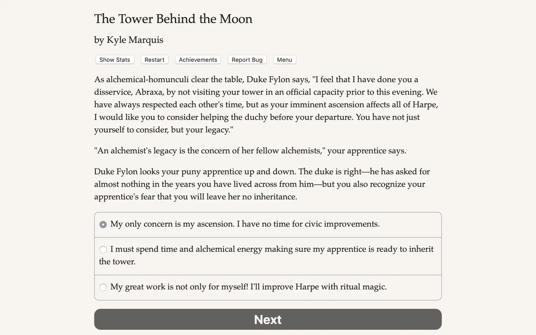 Tower Behind the Moon is a 400,000-word interactive epic fantasy novel by Kyle Marquis, where your choices control the story. It's entirely text-based - without graphics or sound effects - and fueled by the vast, unstoppable power of your imagination.