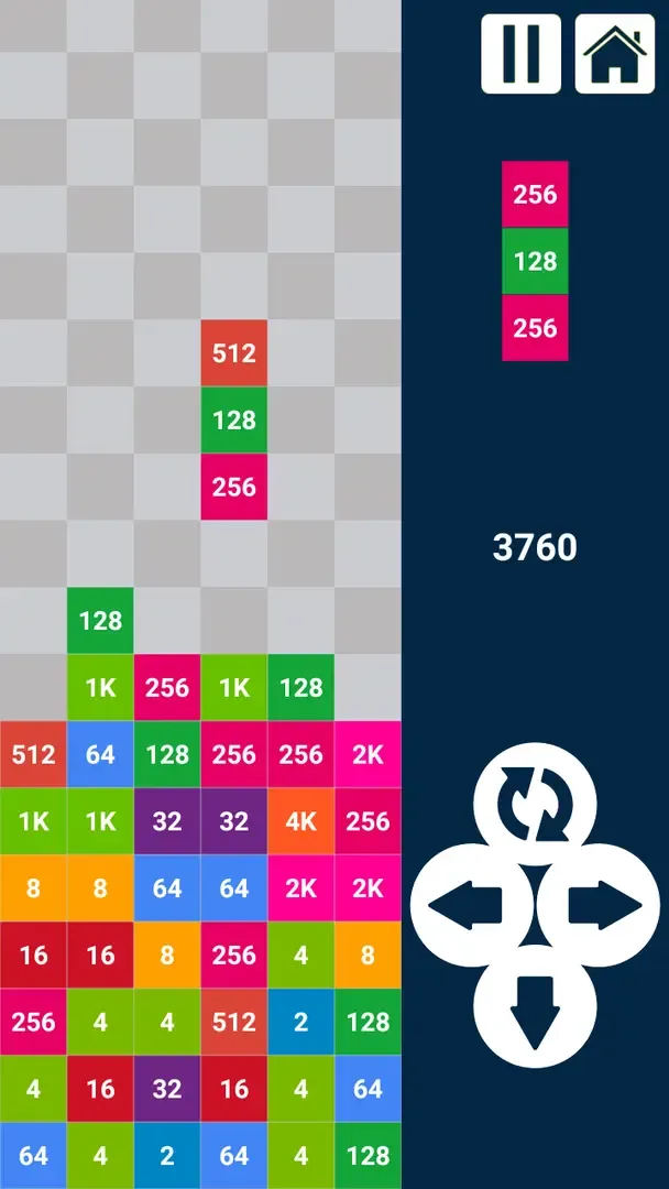 You have to direct the falling columns to make 3 or more same numbers adjacent to each others only horizontally or vertically. Then, their sum will be converted to the nearest number in the series (2, 4, 8, 16, 32, 64, ...), It’s the repeated multiplication of number 2.