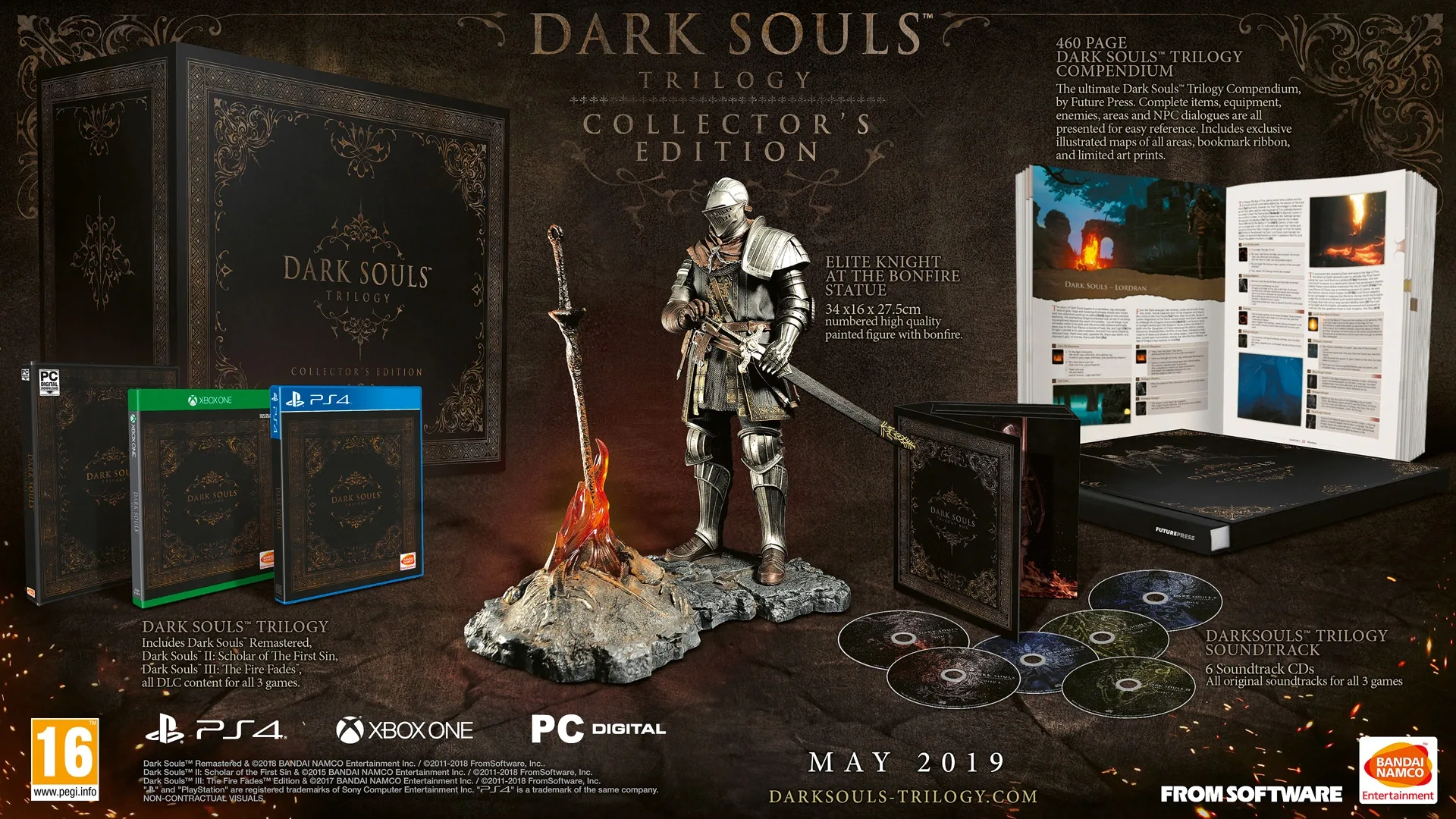 The Dark Souls Trilogy includes Dark Souls Remastered, Dark Souls II: Scholar of The First Sin, Dark Souls III: The Fire Fades, plus all DLC content for all three games, a high-quality, numbered, and hand-painted 34cm Elite Knight at the Bonfire statue, the Dark Souls Trilogy soundtrack – featuring 6 soundtrack CDs with music from all three games, and a 460-page Dark Souls Trilogy compendium – containing illustrated maps with boss and NPC locations, item encyclopedia, bestiary of enemies and bosses, and a manuscript of all dialogue from each game reiterate.