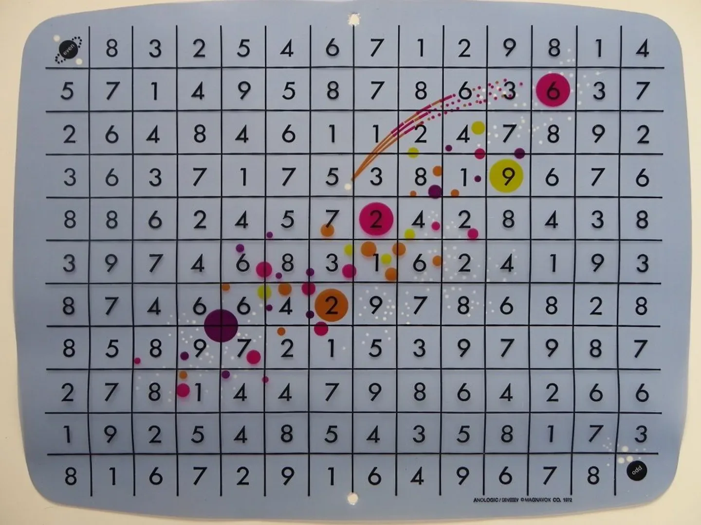 Analogic is one of the 12 original games that were shipped with the Magnavox Odyssey system. It runs on Cartridge No.3 and uses play-chips with an overlay. A math game where players can move to either squares depicted on the overlay based on if the number on the square is even or odd and is the sum of the other player's move and another number