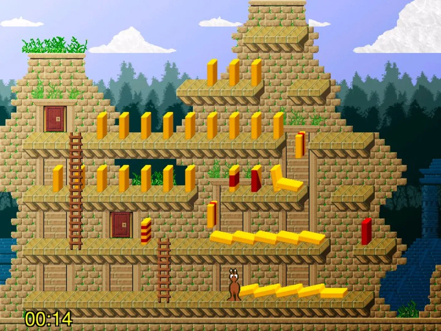 Pushover is a platform puzzle game developed by Red Rat Software and published by Ocean Software in 1992 for the Amiga, Atari ST, DOS and Super NES. Notably, the game was sponsored by Smiths' British snack Quavers (now owned by Walkers), where the game plot revolves around the then Quavers mascot 'Colin Curly' losing his Quavers packets down a giant ant hill. The player is then tasked with controlling 'G.I. Ant', a large soldier ant, to recover the Quavers by solving a series of puzzles. The SNES version lacks the Quavers branding, and instead the aim is to recover bundles of cash dropped down the ant hill by Captain Rat. The game consists of 100 levels of increasing complexity over nine different themed worlds. Each level features several interconnected platforms holding a number of "dominoes". The aim is to rearrange the dominoes, such that with a single push, all of the dominoes are toppled, thus opening the exit to the next level. There are 11 different types of domino, identified by red and yellow patterns, each with different actions. The player controls G.I. Ant, who can move certain dominoes by carrying them one at a time. Various factors can result in failure to complete a level. As well as toppling all of the dominoes, the player must be able to access the exit door once the dominoes have fallen. For instance, the player will be unable to reach the exit if a ledge leading to the exit has been destroyed, or if a gap leading to the exit has not been bridged, or if a line of dominoes lie across the exit. G.I. Ant may die by falling from a large height, by falling off the bottom of the screen, or by being crushed under a falling domino. The player is then greeted with the message "You Failed, You Died" and has to restart the level. Also, the level will be failed if any dominoes are destroyed by landing one domino on top of another. Each level has a time limit during which it must be completed. However, if the time runs out the player is still able to continue with the puzzle if they wish. By pausing the game once the time has run out, a small hint will be displayed, giving advice on how to complete the level. As a side note, the hint for level 98 informs the player that the game's designer cannot remember how to complete the level without trickery ("Use a drop! There is a way to make it work with a push, but I can't find it!"). The themed worlds, in order, are an industrial complex, an Aztec world, a space station, an electronic world, a Greek temple, a Medieval castle, a Meccano-inspired world, a dungeon and a Japanese temple. Each world has 11 levels, making a total of 99 regular levels. A packet of Colin's Quavers is retrieved after each world, with nine packets in all to be collected. Many of the early levels are tutorials demonstrating how each type of domino will act. Often there is only a single solution to each level, though some levels have multiple solutions. The final level, level 100, must be completed using dominoes with hidden markings. A password system allows the player to continue an earlier game, without having to restart from the first level. Additionally, upon completing a level the player gains a token, which once a level has been failed, allows the player to return to the point before the domino push, rather than having to return to the initial state of the level.