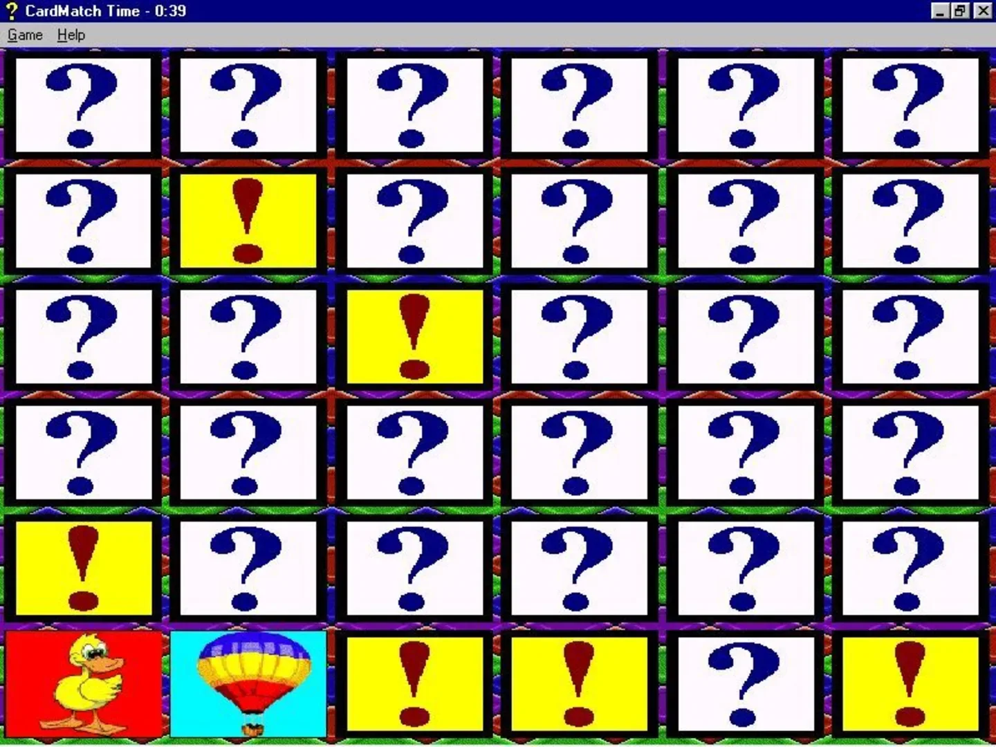 The player is shown thirty-six picture cards turned face down and must turn them over, two at a time. Matching pairs are removed from play, non matching pairs are turned face down again.