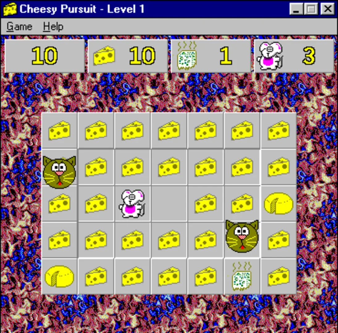 Cheesy Pursuit is a single-player, arcade, strategy game where the object is to achieve a high score. The game is played on a grid in which all squares are filled with kinds of cheese. The player controls a mouse which is initially in the centre of the grid. The object of the game is to eat all the cheeses without being caught by the cats which patrol the game area. As the player progresses through the levels there are more patrolling cats and they move faster and in less predictable paths.
