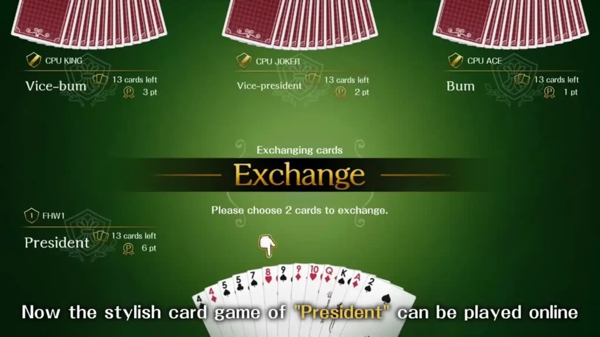 The second title in our ‘F' series, in President F.net your task is to get rid of your cards as quickly as possible! The player to clear their cards becomes ‘President' and deals for the next round, so you'll need to rise up the ranks and triumph over your opponents!