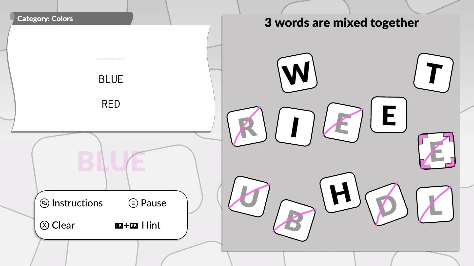 The mixed-up anagram puzzle, where three connected words are hidden among a jumble of letters.