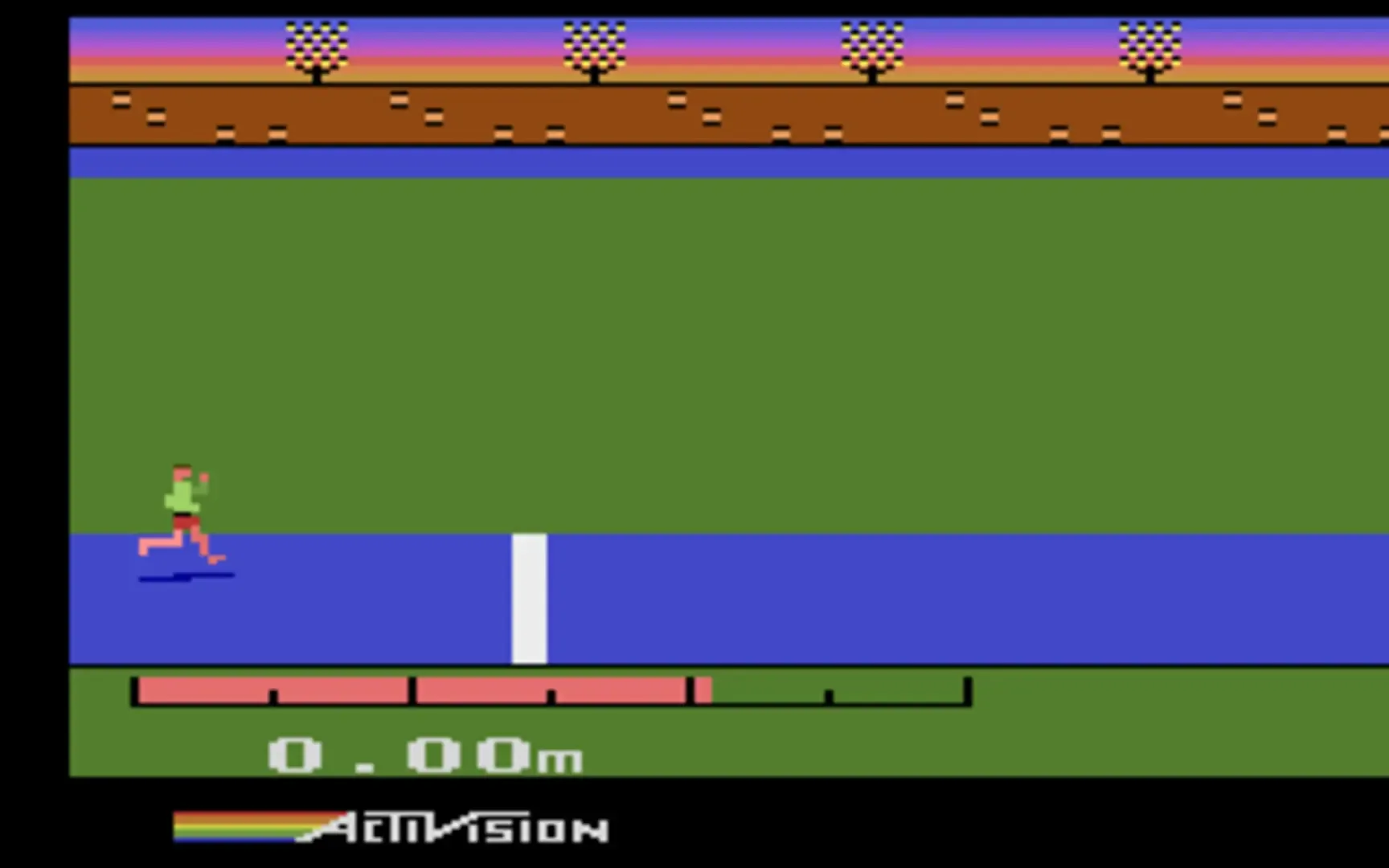 The Activision Decathlon offers a comprehensive Olympic-style gaming experience, simulating all ten events of a real-life decathlon. Players can compete solo or with up to three others, tackling events such as sprints, jumps, and throws, either in sequence or individually. The gameplay mechanics blend rapid joystick movements with precise button timing, challenging players to balance speed and accuracy. Events like running require vigorous joystick waggling, while hurdles and field events demand well-timed button presses for optimal performance. Points are awarded based on performance in each event, with the highest overall score earning the coveted gold medal, creating an engaging and competitive virtual athletic experience.