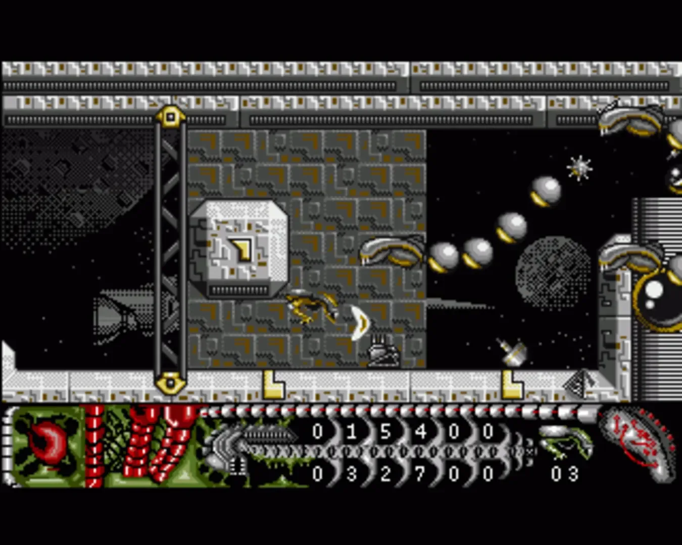 You, Kai are about to marry your sweetheart Medb, but Slough Feg and his minions have kidnapped her and taken her to the far side of The Cave of Dreams. Swearing a bit too loud about rescuing her, Slough Feg has heard you and turned you into an insect. With the help of magic from the Druid Lords though, you set off on your quest. To help you, some minions leave behind either a power-up for your weapon or Zen, the currency of The Cave of Dreams. Zen can be spent in the shops that litter the landscape. Here you can buy health or extra weapons. Kai has three lives which are lost when his two energy dots turn from white, cycle through various colours before turning black. Alien World is a scrolling shoot-em-up. Various levels scroll horizontally while others scroll vertically. The screen will only scroll when you move so far across the screen. You cannot re-trace your steps. As well as the main playing area you can also see your score, amount of Zen, Energy dots, lives and various weapons. The joystick moves Kai, but not touching the joystick lets gravity kick in. The fire button fires your weapon.