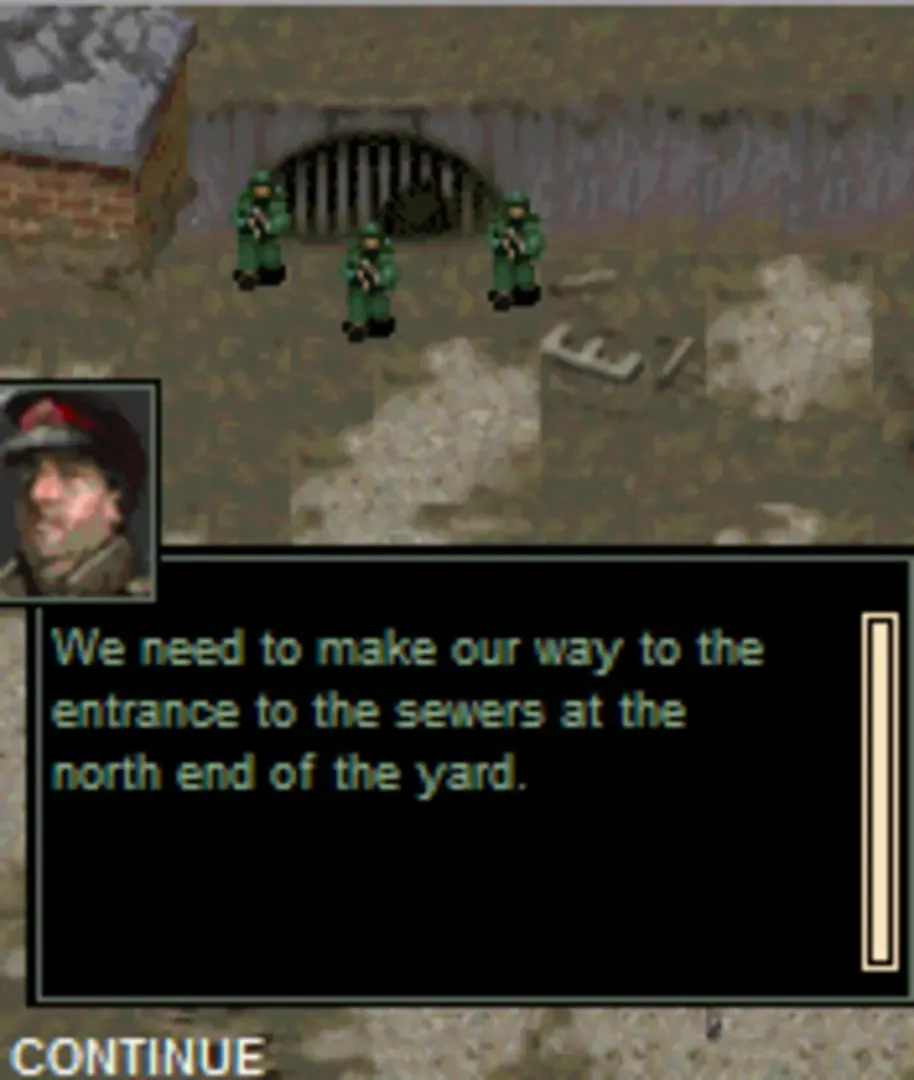 In the mobile version of Call of Duty 2, you take the roles of various soldiers fighting through World War II. There's four years (1942-1945), each one with two soldiers to choose from, each with their own set of missions. Everything but the first missions are locked, and you have to complete them to unlock the later ones, eventually unlocking the next year as soon as you finish every mission in the earlier one. The missions can vary wildly, from location to objective and weapons. In some missions you have a team of soldiers to help you out, in others you have to work solo. You'll be instructed along the mission on what to do, as well as receiving hints and tips on how to do it. You may have to take down enemy troops, call in airstrikes, hide from bomber attacks, destroy enemy vehicles or even be left all alone sniping enemy units. The time you take to beat the mission is stored so you can try to beat the default "best time" or your own best time. The game works in a pseudo top-down view, since the game works like a 2D top-down but the scenario is rather 3D. Most of the maps are similar, having you start on the bottom and having to make your way up to the top to progress through the mission. You can crawl under sandbags or hide behind buildings for cover, and sometimes there's medics spread around to assist you. The weapons are varied, from pistols, machine guns, sniper, bazooka or even a walkie-talkie to call in airstrikes. Most of the weapons simply fire forward, but to help you aim, some can "auto-point" at nearby targets, and others have a reticule that you move around with the D-Pad.