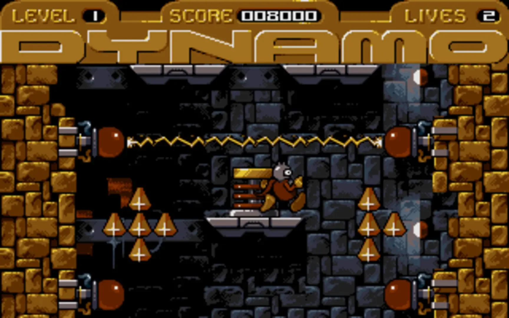 Captain Dynamo is a platform game developed by Codemasters and released in 1992. Versions were published for the Commodore Amiga, Atari ST, Commodore 64, ZX Spectrum, Amstrad CPC, and MS-DOS. Captain Dynamo, an aging superhero, is brought out of retirement to recover a haul of stolen diamonds from the trap-infested rocket-ship of the villainous Austen Von Flyswatter. The game is a vertically scrolling platformer in which the player attempts to collect as many diamonds as possible in each stage and then enter the teleport unit at the top. The task is complicated by various mechanical hazards and creatures. The game was later ported for play on mobile phones.