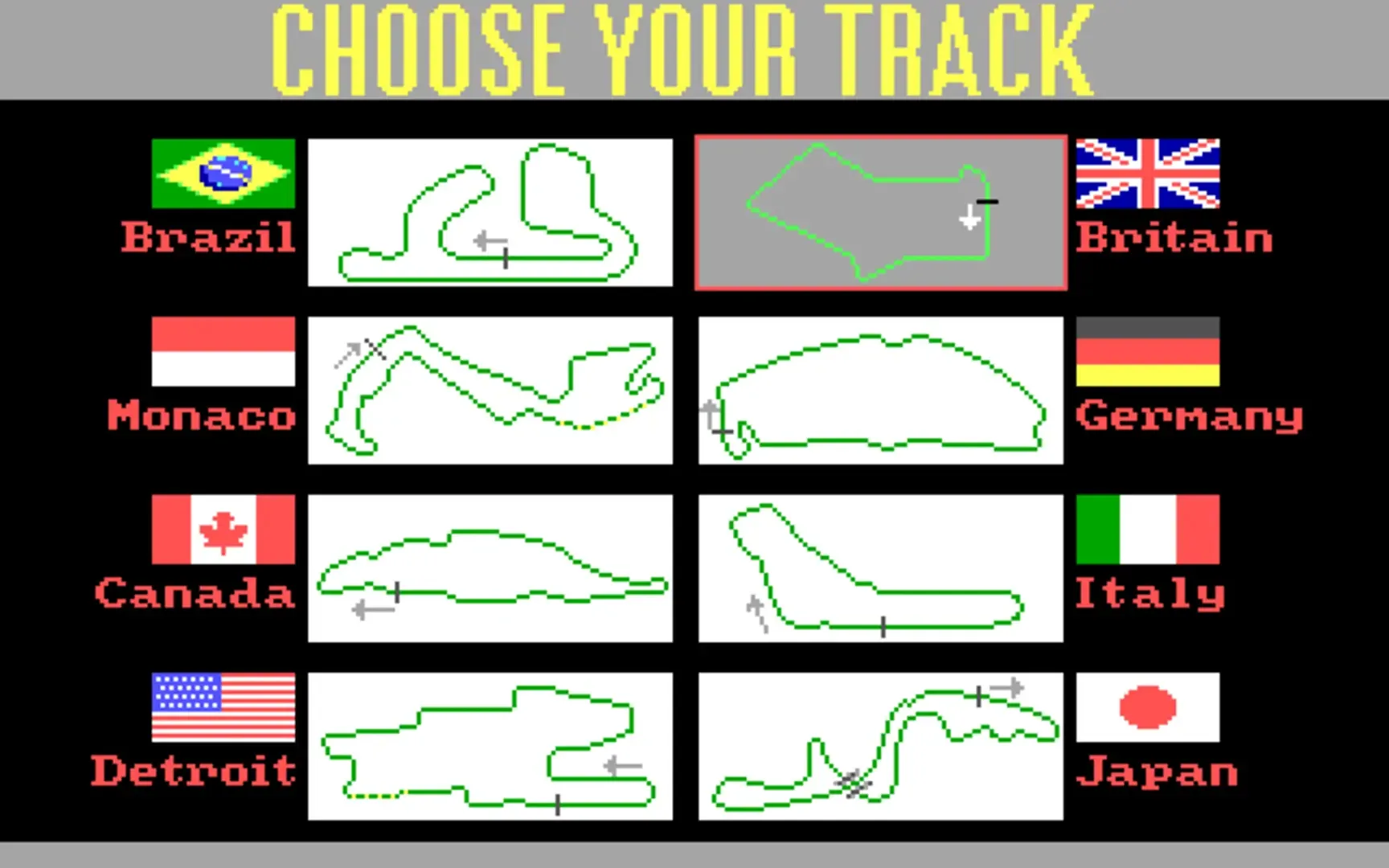 Formula One racing is recreated in detail in this simulation. You have the choice to drive a Ferrari 187/88C, a McLaren MP4/4 or a Williams FW12, each with different qualities. Rival drivers also have their own styles and strengths, and to win the World Championship you will have to master these. Pitstop timing and planning is crucial as well, although only tires are changed in late-1980s F1. You can choose whether to drive a single race at Brazil, Britain, Monaco, (Western) Germany [Hockenheim], Canada, Italy, Detroit and Japan [Suzuka] or to drive a full championship on every track. Every Race includes a qualifying round. The graphics in the game are sprite-based.