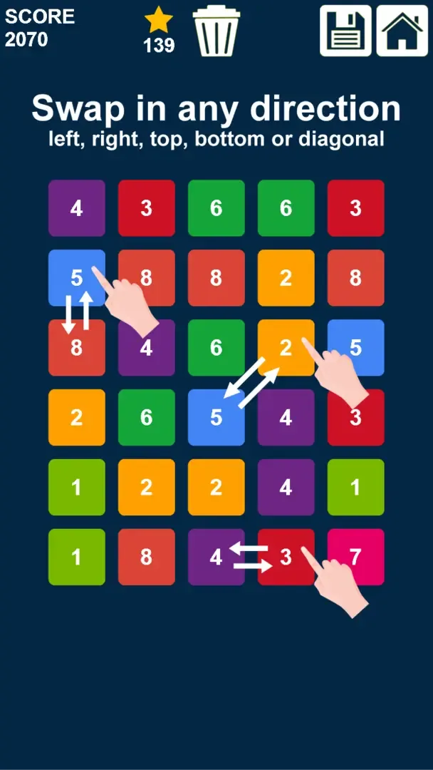 Swap n Merge is a brand new puzzle game. It is totally free merge numbers game without in-app purchases. Swap n Merge is a relaxing and brain training match 3 number game. How to play: - Swap 2 Numbers in any direction. - match 3 or more same numbers horizontally and vertically. Rules: - No automatic swap-back even there is no match. - Every match gives 1 star. - Every swap without match costs 5 points. The cost is incremented by 5 points every level. - It costs 100 stars to remove a number from the grid using the Remove button. - It is your responsibility to save your progress to resume it later by hitting the Save button. Every new level: minimum and maximum generated numbers are increased by 1. So try to match all minimum numbers before the next level because they will not be generated again. Play, enjoy and have fun.
