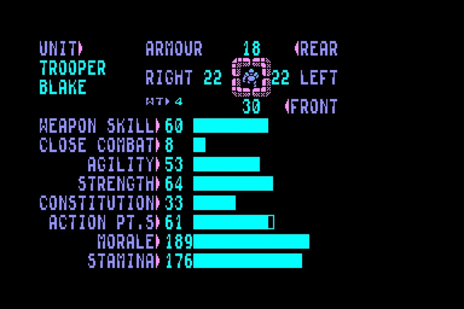 Laser Squad is a turn-based tactics war game where the player completes objectives such as rescue or retrieval operations, or simply eliminating all of the enemy by taking advantage of cover, squad level military tactics, and careful use of weaponry. The squad's team members are maneuvering around a map one at a time, taking actions such as move, turn, shoot, pick up and so on that use up the unit's action points. More heavily laden units may tire more easily, and may have to rest to avoid running out of action points more quickly in subsequent turns. Morale also plays a factor; a unit witnessing the deaths of his teammates can panic and run out of the player's control. Including the expansion pack, there are seven scenarios in total, each one with its own difficulty settings and squad allocation Laser Squad originally came with five mission scenarios, with an expansion pack released for the 8-bit versions, containing a further two scenarios. Reaction from gaming magazines was positive, gaining it high review rating and several accolades. The legacy of the game can be seen in other titles like the X-COM series, especially the acclaimed UFO: Enemy Unknown which was also created by Julian Gollop and was initially conceived as a sequel to Laser Squad