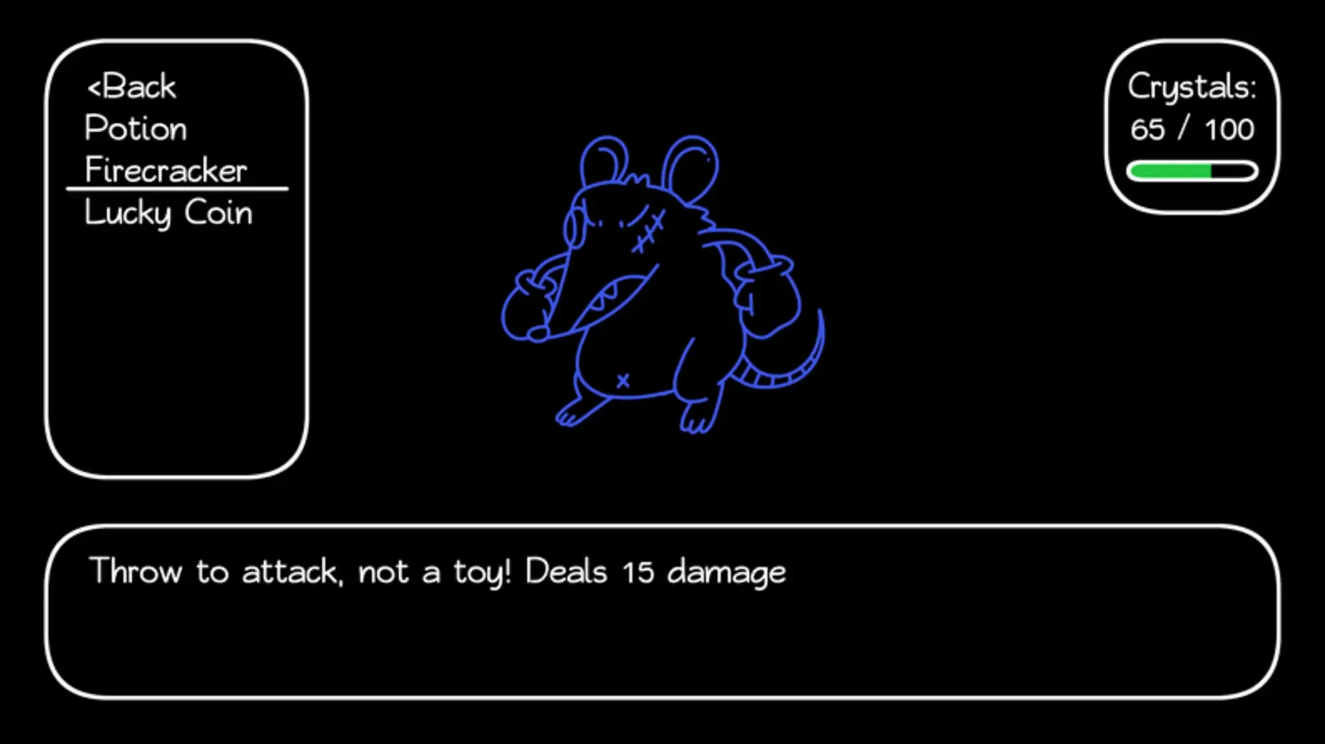 Short and sweet RPG game with only one stat to manage. Crystals replace health, magic, money and other stats! Manage your crystals while battling through waves of weird monsters in this turn-based RPG. After each battle there's an opportunity to meet the inhabitants of a peaceful town and stock up on items and useful skills. But beware: everything has to be paid with crystals and if you run out, your life comes to an end. Will you be killed by a raging tomato head? Will you shop yourself to death? Or will you triumph over all the demonic forces that await you? Is there ONLY ONE strategy to win? Made for GMTK Jam 2019 within 48 hours.