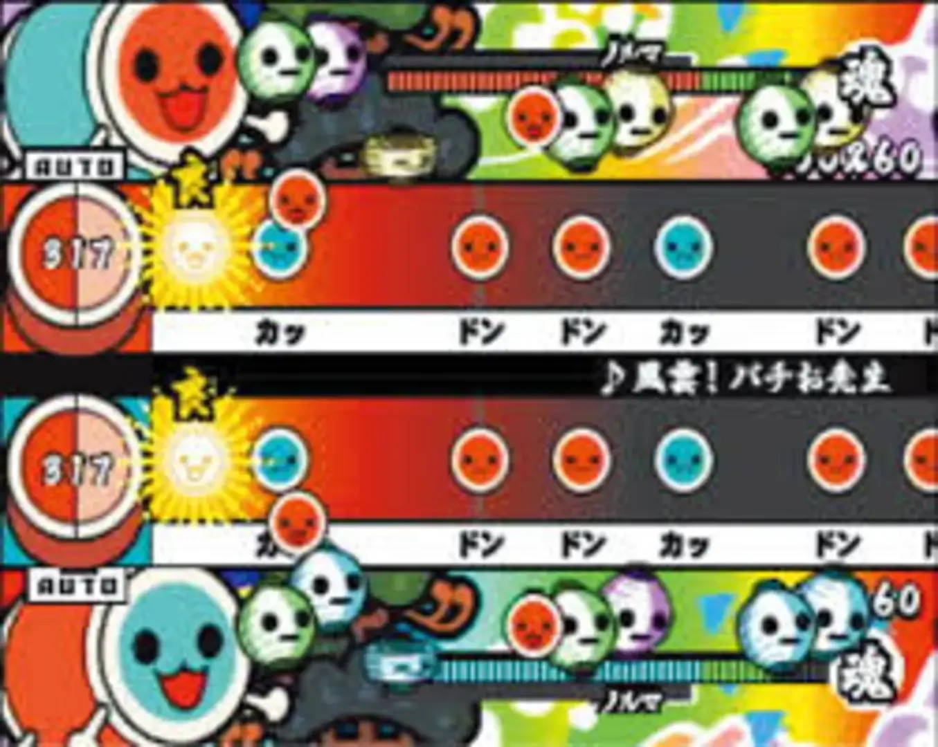Tatacon de Dodon ga Don was the first Taiko no Tatsujin game to be released on the PlayStation 2, the first console to feature Taiko games. All the first-run copies of the game came with a Tatacon, a small plastic drum which is identical in functionality to the bigger arcade drums. As for the future console Taiko titles, the game can also be played with buttons as the alternative control scheme. Due to the first arcade versions relying on the PS1-grade Namco System 10 board, the game has PS1-grade graphics and longer load times in order to reproduce a good arcade fidelity. For the same reason, the arcade-styled Arcade mode (together with unique ending/Game Over sequences) was ported for the game, together with the (then popular) Battle mode. Arcade mode is also the staple for unlocking secret tracks, for this and the next 3 console games. The console-exclusive features added to the first console Taiko game were a Free mode for playing the songs without the song selection constrains of the Arcade mode, the fast-button pressing Don-Chan Race (the first in many Taiko games for Ps2) and the Safari Mode. Free mode also features console-exclusive options, such as custom Taiko sounds selection and an Auto-Play function for every song, which can be toggled on and off by pressing the Select button in the song selection screen. About Safari mode, it plays much like the Donkey Konga games' Survival mode, in which players clear a number of randomly-chosen songs on a set difficulty, starting with the Tamashii gauge full (and not able to recover ticks from errors). The number of songs changes according to the difficulty selected, and the Safari run is won if the Tamashii gauge isn't empty during the play by missing notes.