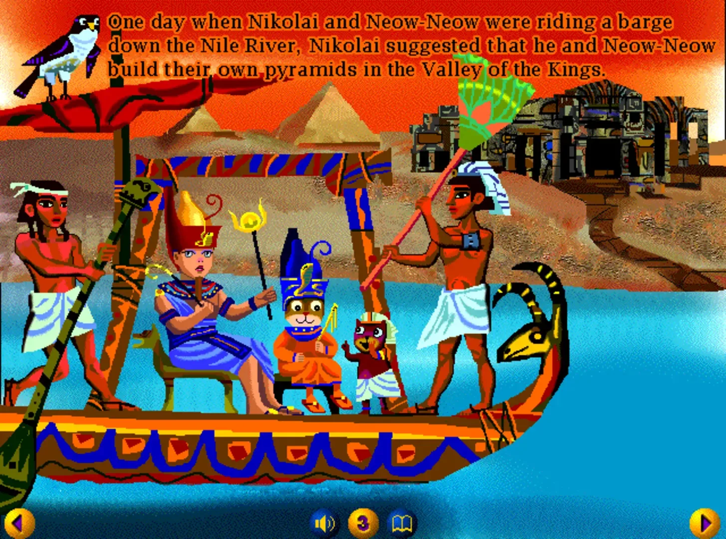 Nikolai's Pharaohs is an entry in the Nikolai series. Nikolai and his cat Neow-Neow become mighty Pharaohs in ancient Egypt, and build their own pyramids, but Neow-Neow copies Nikolai’s design and gets lost inside his pyramid. The player can discover how the great pyramids of Egypt were built, and explore the insides of each pyramid. The player can also learn about the beliefs of ancient Egypt and can also play a game with the snake and marbles. The game plays as an interactive book for the most part, and is targeted to children ages four and up.