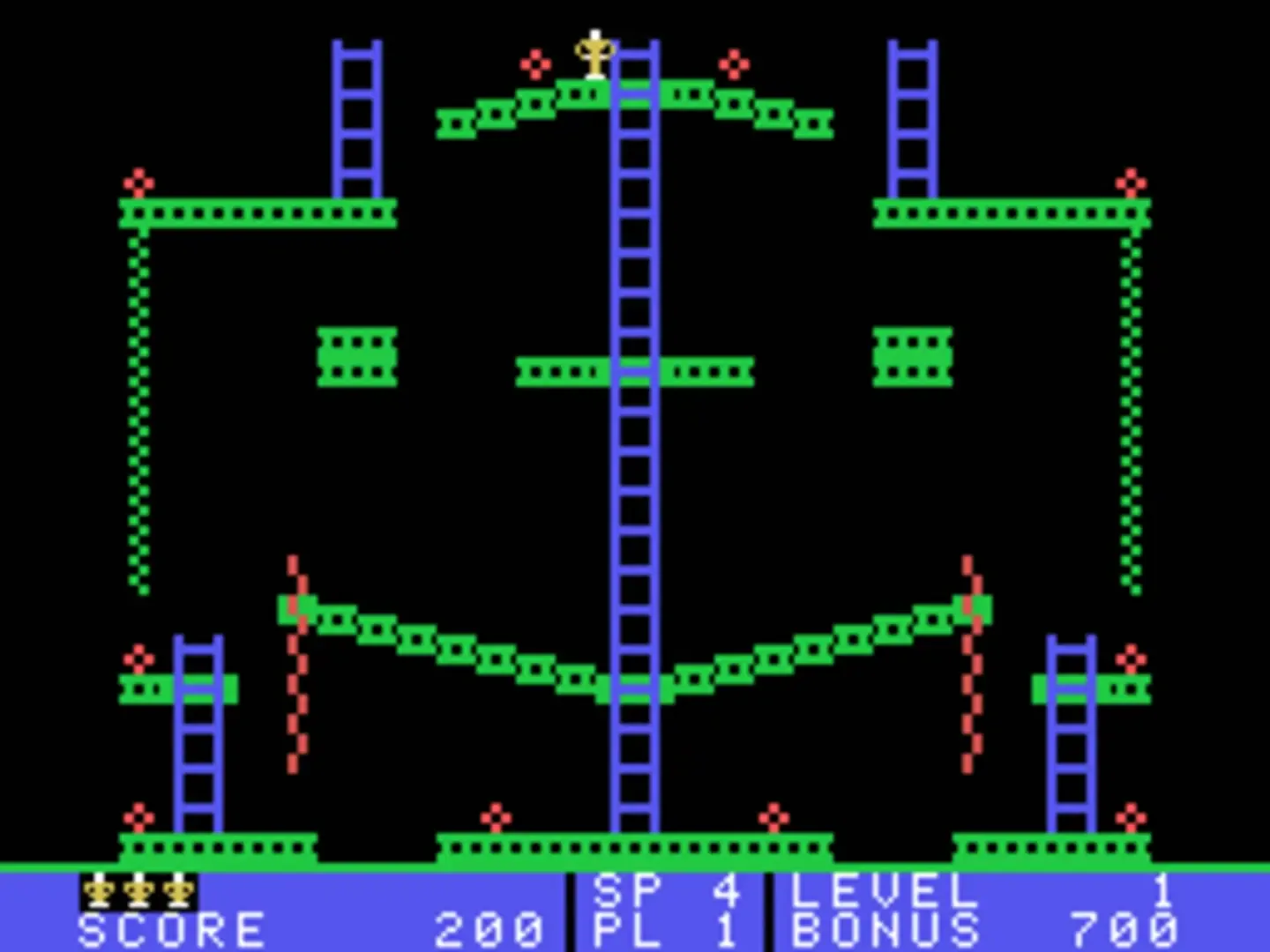 Jumpman Junior is the sequel to Jumpman and features similar gameplay with all new levels. As Jumpman, your goal is to disarm all of the bombs on the level before time runs out. Each level consists of a variety of platforms, ladders, and ropes you will need to jump and climb to reach the bombs. To make the game more challenging, a bullet will fire on the screen from time to time which will cause Jumpman to lose a life if hit. Each level has a different theme to it, and a few also have additional dangers as well. You will encounter deadly fires, the bouncing hellstones, moving ladders, disappearing platforms, and more.