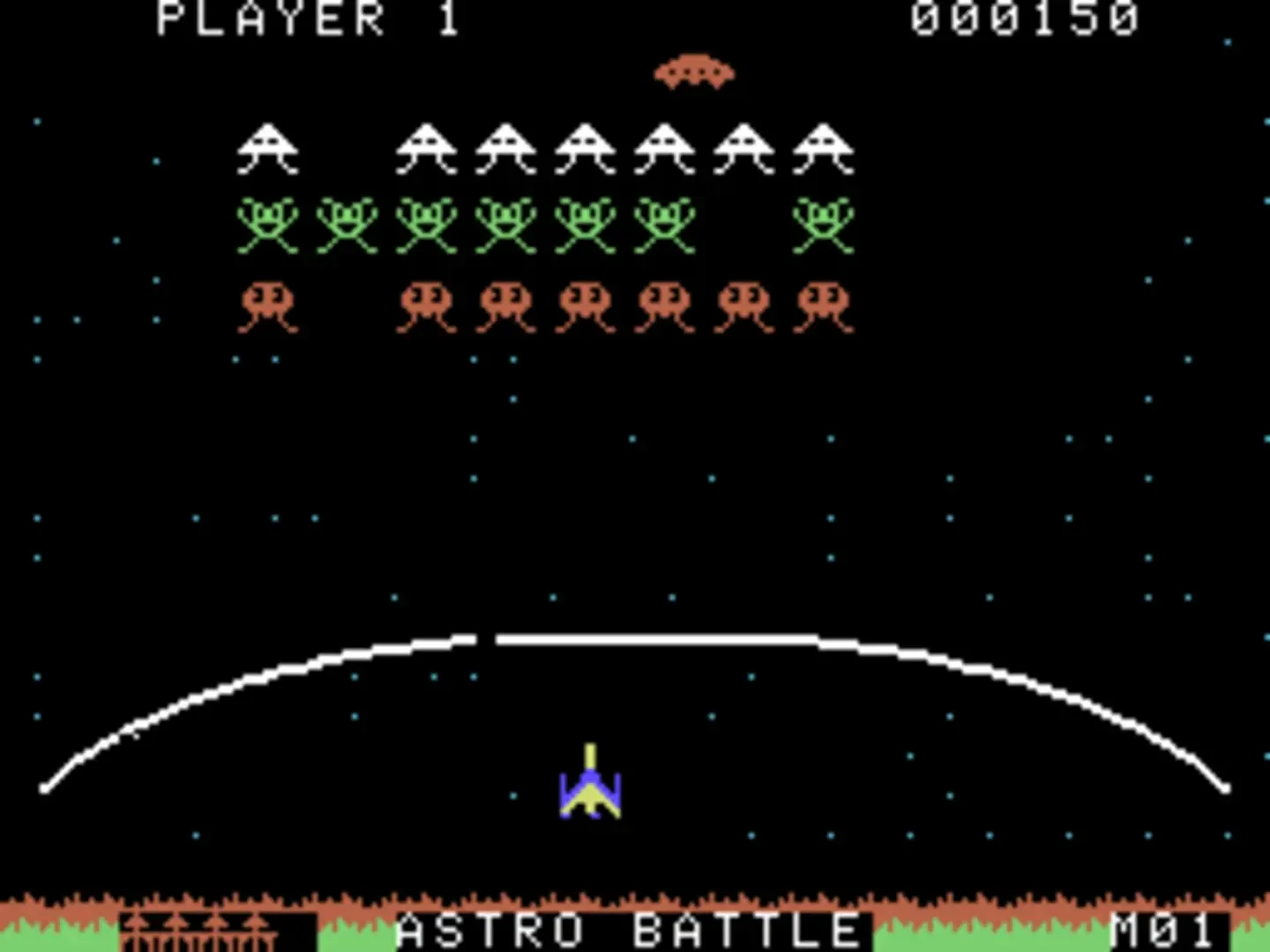 Gorf actually consists in the Arcade version of five different types of space shooters. The first one ist basically is a Space Invaders clone. In the second one a formation of space ships is hovering at the top of the screen while single space ships will disengage from the formation and dive down at you. The third variant is a Glaxian clone and only available in the Arcade version. In the fourth mini-game the enemy will come out of a circular hyperspace field and attack you. After having destroyed four of your attackers the game proceeds to the fifth game stage. Here a huge mothership is dropping bombs at you from the top of the screen. You defeat the mothership with a well placed projectile hitting it between its two major sections. After that the game starts from the gebinning on a higher difficulty level.