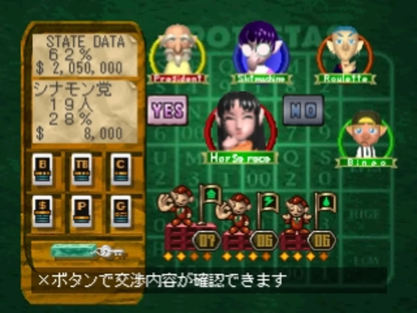 Potestas is a political simulation game that takes place in a fantasy land. The player can check every part of the land to know what the people of each part of the land needs and try to solve their problems, after checking in each turn he got to take different decisions and depending of their choices all of them got to be taken to the parlament where there will be a voting, if the action is elected it will be done.