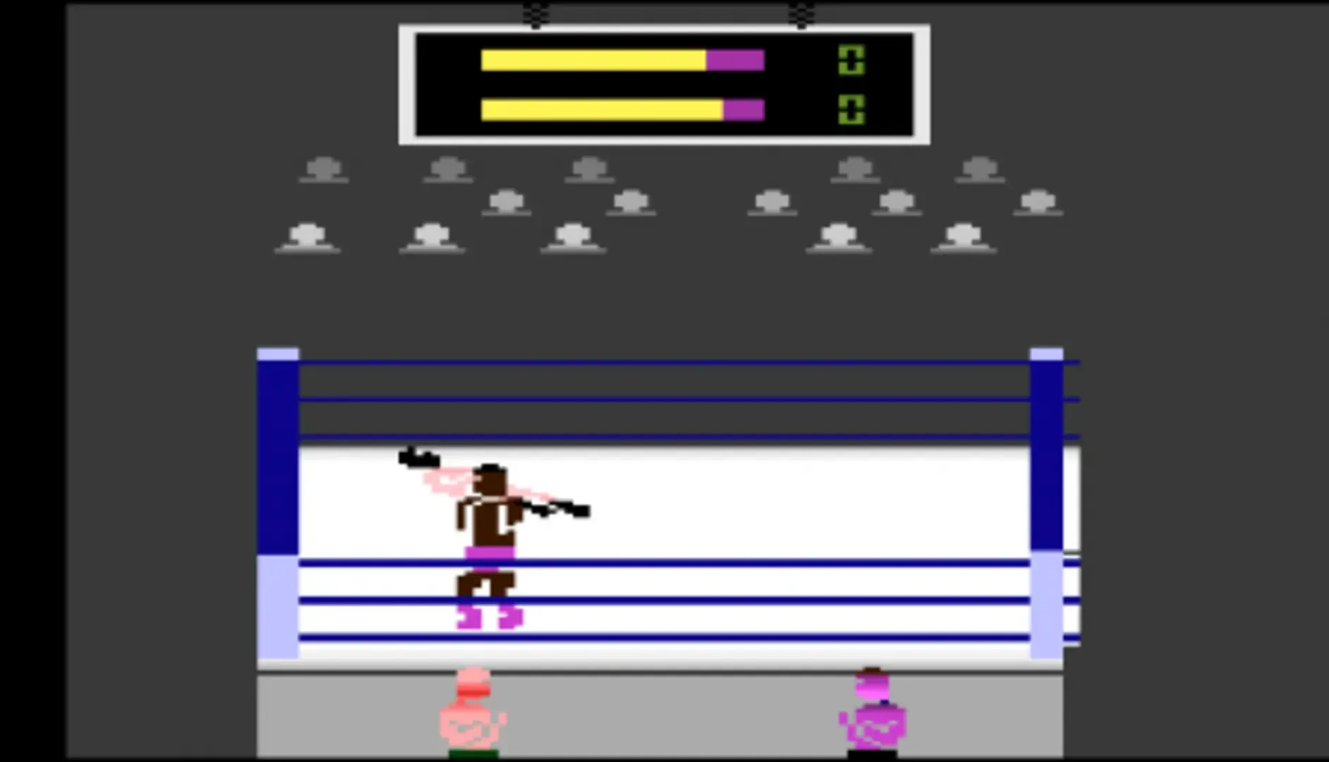 Calling all wrestling maniacs! Tonight's the title match! Climb into the ring and strut your stuff - mix it up with some of the world's most savage wrestlers as you compete for the "Absolute Title Belt." But prepare yourself for Skin Head's pulverizing rope dives, Mad Dog's vicious ariplane spins, Big Chief's bone-crushing bear hugs and Mr. Mean's paralyzing body slams. The sizzling action never stops, whether you battle it out one-on-one, or go to war for the Tag Team Belt. And after it's all over, if you think you're really good, match yourself against the computer to see who's the ultimate ring warrior.