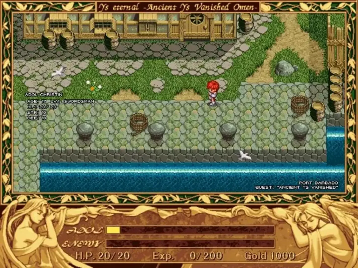 Ys Eternal is a remake of The Ancient Land of Ys. The game features technically superior visuals and soundtrack, as well as more detailed animation (e.g. enemies actually visibly collapse and die rather than blink and disappear). The most significant change in this release is the addition of an entirely new opening area, the town Barbado and its surroundings. Overworld areas have been expanded as well. There are also many more characters and a few additional side quests in this version.