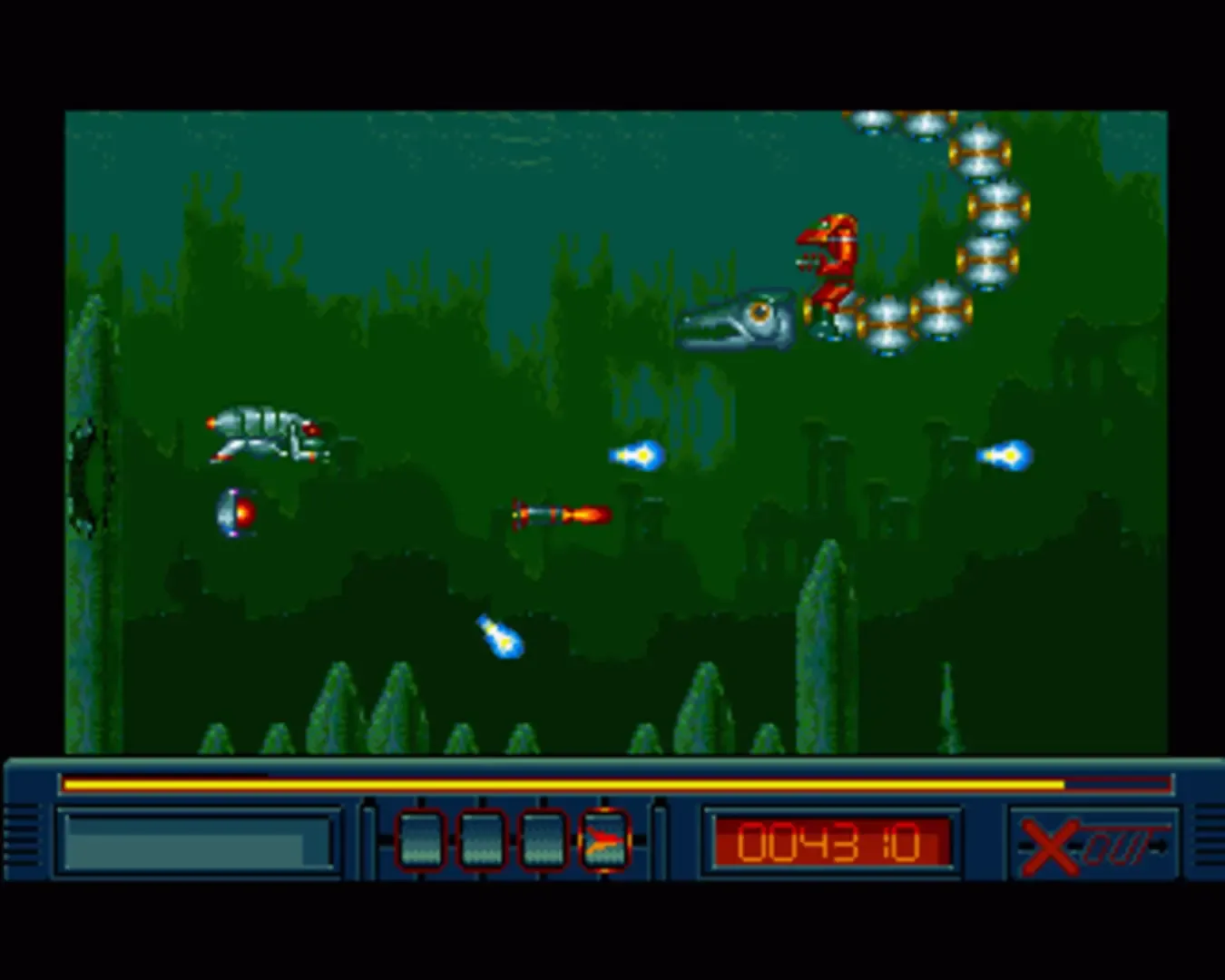X-Out is a horizontally scrolling shoot-em-up with eight levels and an underwater setting. Between levels, the player visits a shop and use their game score to purchase new submarines and equipment. The submarines come in four different variants, and additional purchases act as additional "lives". Each can be equipped with a one-way, two-way or three-way fire weapon of increasing power (and thus cost). Secondary weapons include sonic waves, powershots and target-seeking missiles. The player can also purchase auxiliary satellites and specify their movement pattern, which can be circular orbits, vertical and horizontal movements, or an intercepting action.