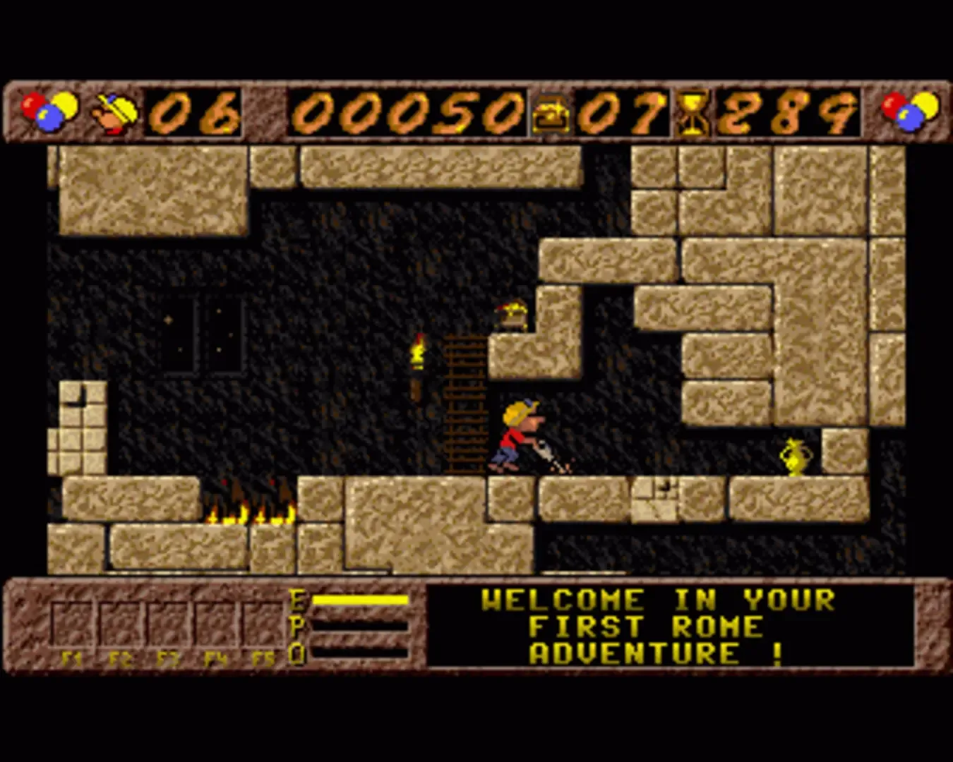 P. P. Hammer and his Pneumatic Weapon is a platform game with puzzle elements. It draws obvious influence from the earlier game Lode Runner. In the game, you control a character called P. P. Hammer, who is on a quest to discover and acquire all treasures from a series of more than 60 levels. These levels are divided into four graphical themes: Ancient Rome, Ancient Egypt, Medieval castles, and ice. A fifth theme, LegoLand, appears on bonus levels. Each level in the game is made up of rectangular blocks, and contains various things including treasures, enemies, locked doors, bonus items and traps. P. P. Hammer carries a jackhammer, which allows him to drill through a block he's standing next to. As in Lode Runner, drilling through more than one layer of blocks requires creating a triangle-shaped cavity more than one block wide, and blocks reappear after a short while. A block reappearing on top of P. P. Hammer kills him. P. P. Hammer can collect treasures and various power-up potions lying around the level. When he has collected all the treasures, the exit door opens, and going through the exit door completes the level. The player doesn't have to play from the beginning of the game every time; after completing each level a level password is displayed, allowing the player to continue from that point at a later time.