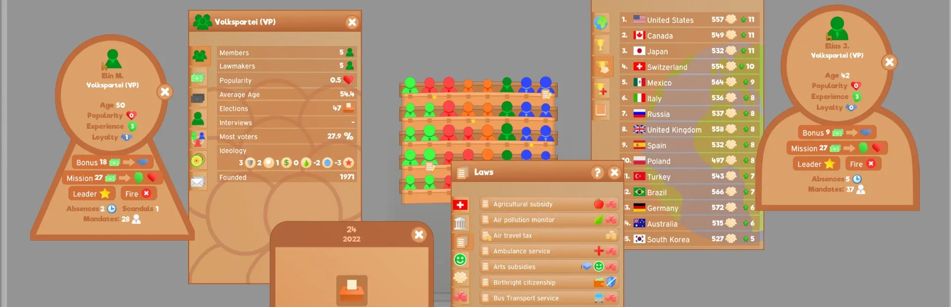 Lawgivers is a turn-based political simulation game. Run for elections with your own party and enter parliament to approve or abolish laws. Appoint the president and decide whether you want a democracy or just a fake one instead.