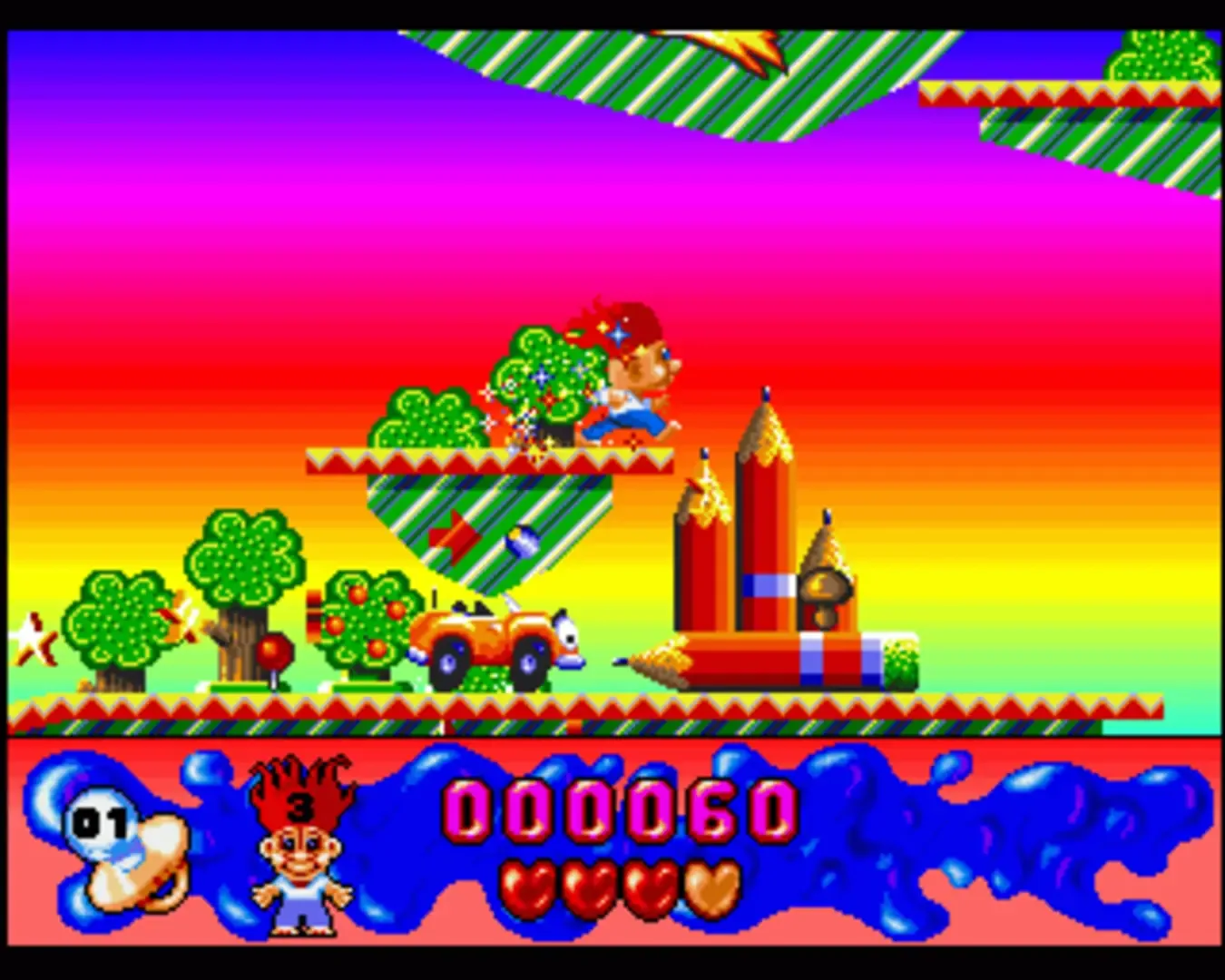 This platform game features the small blue-haired cutesy creatures that were popular around the time (although surely not with most computer game buyers?). You play a Troll roaming the levels in the hope of rescuing as many baby trolls as possible - each level gives you a set minimum to retrieve before you can leave via the Pigstop. Initially you have no weapons, and contact with the nasties costs you energy, but a Yo-Yo can be collected, which can be used not only to kill enemies, but also to smash blocks away and open up paths, and even (with practice) tied to a ledge to allow you to swing across a gap.