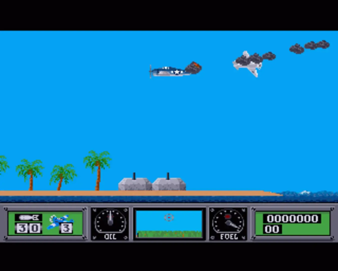 The game is a horizontally scrolling shooter set over a number of World War II missions. The player starts each mission by taking off from an aircraft carrier, which he/she has to protect from attacks by Japanese planes. The goal is to defeat the Japanese by destroying enemy bunkers, turrets and barracks on a series of islands and killing enemy soldiers either with bombs or by machine gun. The weapons to complete these objectives, besides machine guns, are a limited number of bombs, rockets and torpedoes. On some missions, the player must also sink Japanese vessels, such as destroyers, battleships, and aircraft carriers. The player has a finite amount of fuel and munitions, which can be replenished by returning to the carrier. The player's aircraft can be destroyed by accumulated damage from enemy fire or by crashing into the terrain.