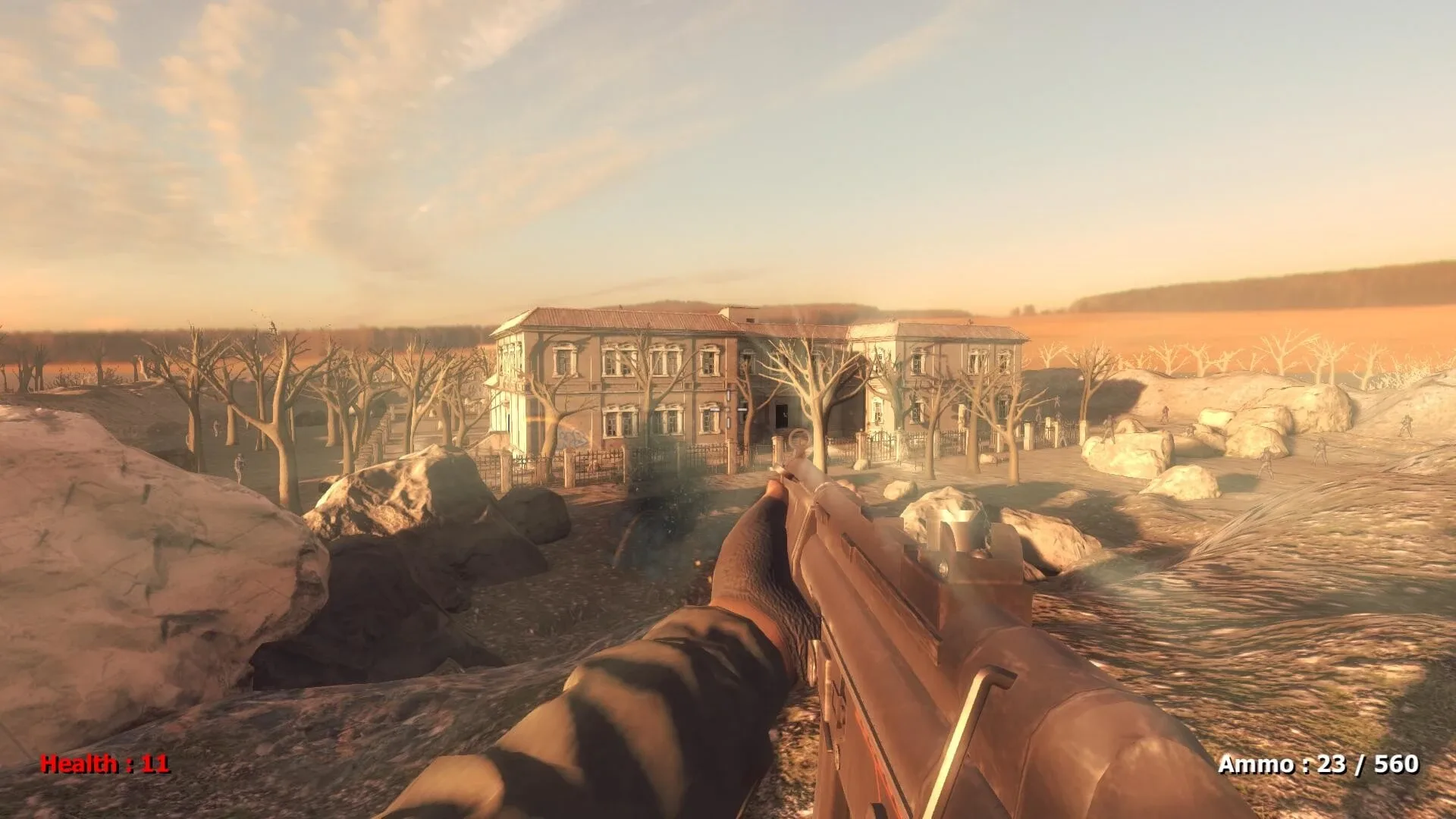 This is a first person shooter game,The player is a shooter with multiple weapons,Players are free to explore the surrounding area,Enemies are scattered around the player and inside buildings,Players can kill enemies or avoid enemy attacks and maintain health,Players can also grab enemy weapons.