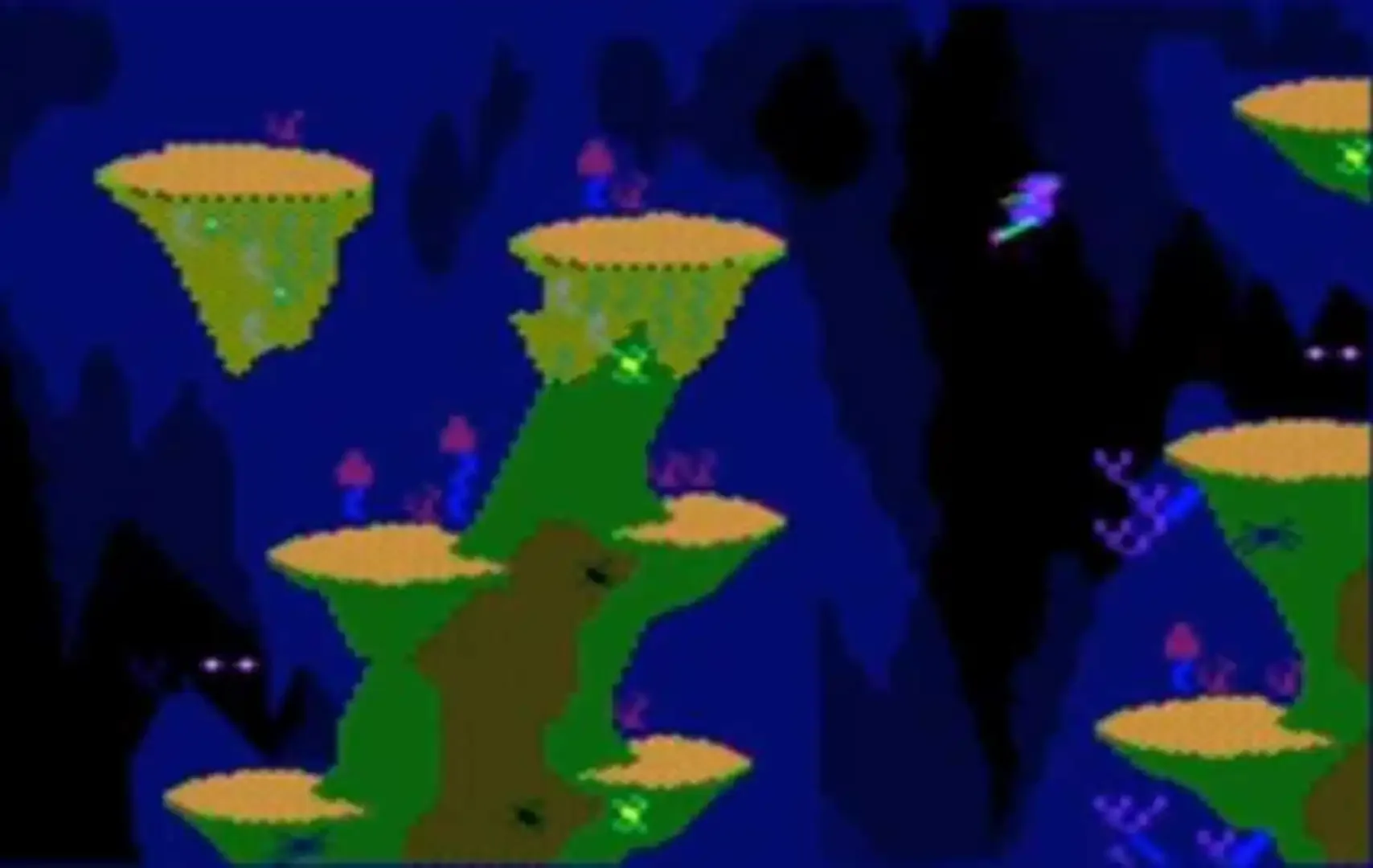 You are far ahead in time, the year 2464 AD and your Space Time Machine has landed on an alien planet, and being of an inquisitive nature, you decide to explore it. You have been gifted with a special kind of power that aids you when you are exploring strange planets. You are able to mutate into the alien beings' form. On this mysterious planet of Ivorus, the beings are minute and flea-like with amazing jumping powers.However, during your exploration, you take an unexpected trip and fall down and down and down through a deep and dark pot hole into a strange cave. All around you are flesh-eating plants, not to mention a hungry pterodactyl...... You must elude these dangers, so utilise your jumping powers to ward off your enemies til you finally escape from the disatrous cave. No sooner are you safe, then disaster strikes again!. Down you go again, but this time the flesh eating plants have multiplied and they don't want you to escape. Good luck!.