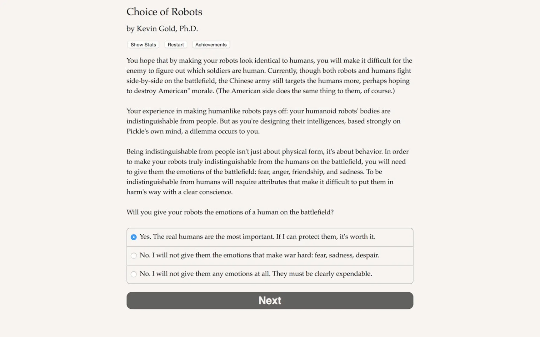 Choice of Robots is an epic 300,000-word interactive sci-fi novel, where your choices control the story. It's entirely text-based - without graphics or sound effects - and fueled by the vast, unstoppable power of your imagination. Play as male or female, gay or straight, with nine characters to romance, four alternate climax chapters, and over seventy achievements to unlock.