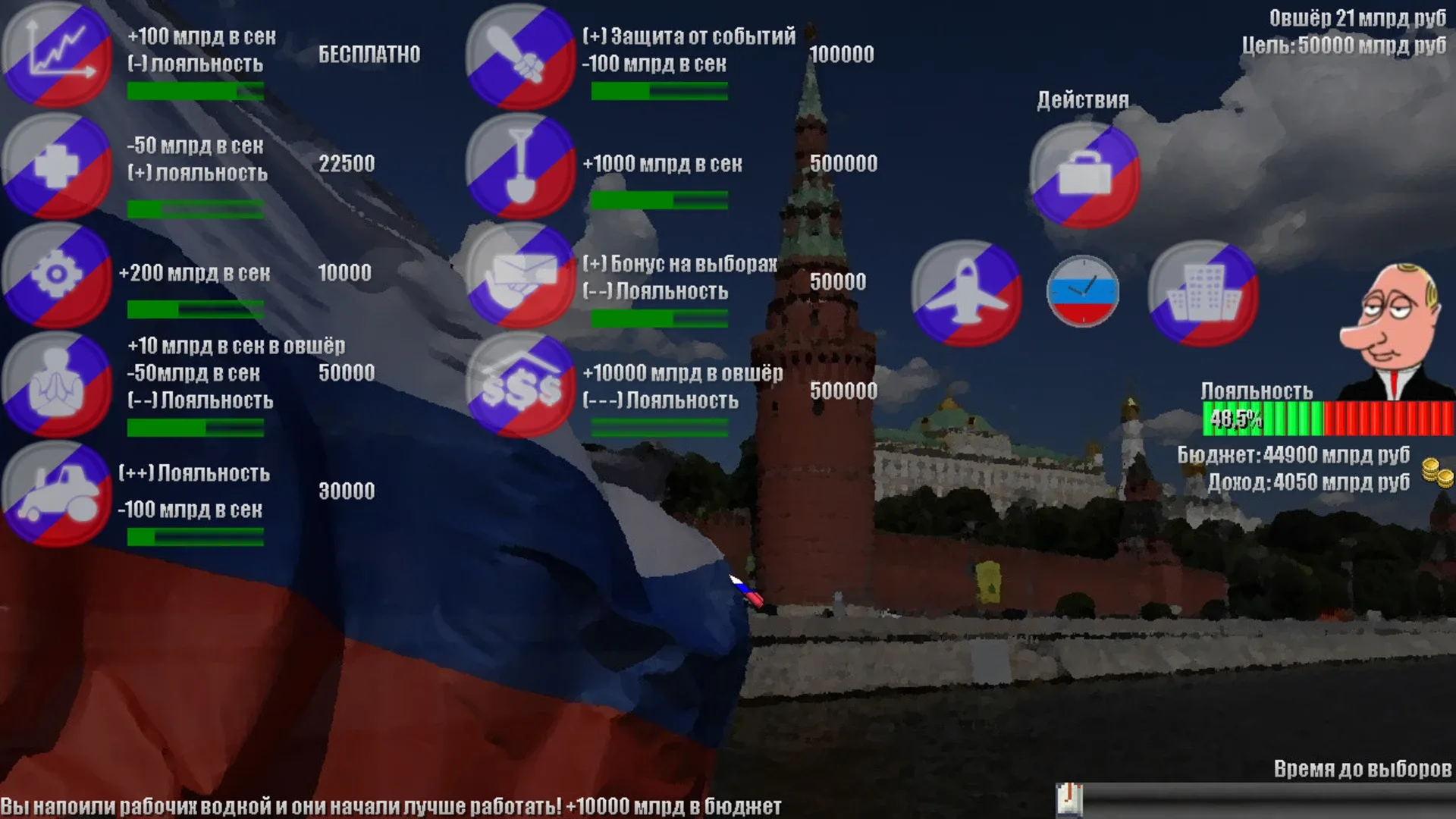 Put In Bad is a simulation game that will allow you to plunge into the difficult life of the president! Objective: to save enough money and leave the presidency.