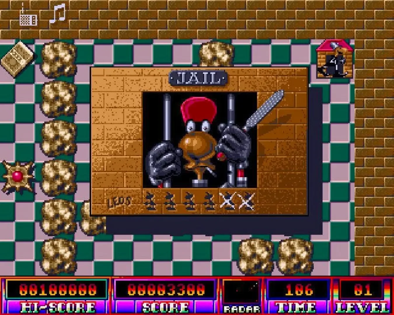 In this top-down puzzle oriented game you have to help Leonardo, a little thief, on his criminal trips. Use your joystick to lead Leonardo through 50 different levels including banks, museums, and warehouses. Pressing the fire button of your joystick you can push everything in your way, except walls. Pushed objects won't stop until they collide with other objects or the police officer and his ghost deputy who are trying to stop your robberies. Every level has a time limit in which you must bring three equal items into one line to complete the level. Each level is larger than the screen, in the lower half of the screen you have a helpful radar for orientation. Running out of time or being caught by the policemen will cost you one of your five lives. If you are able to master the first ten levels you will receive a password, which you can use to start your next game directly on this level. You can unlock more passwords after mastering Levels 20 and 30. From Level 30 to the final Level 50 you must master the game with your 5 lives, as no more passwords are given.