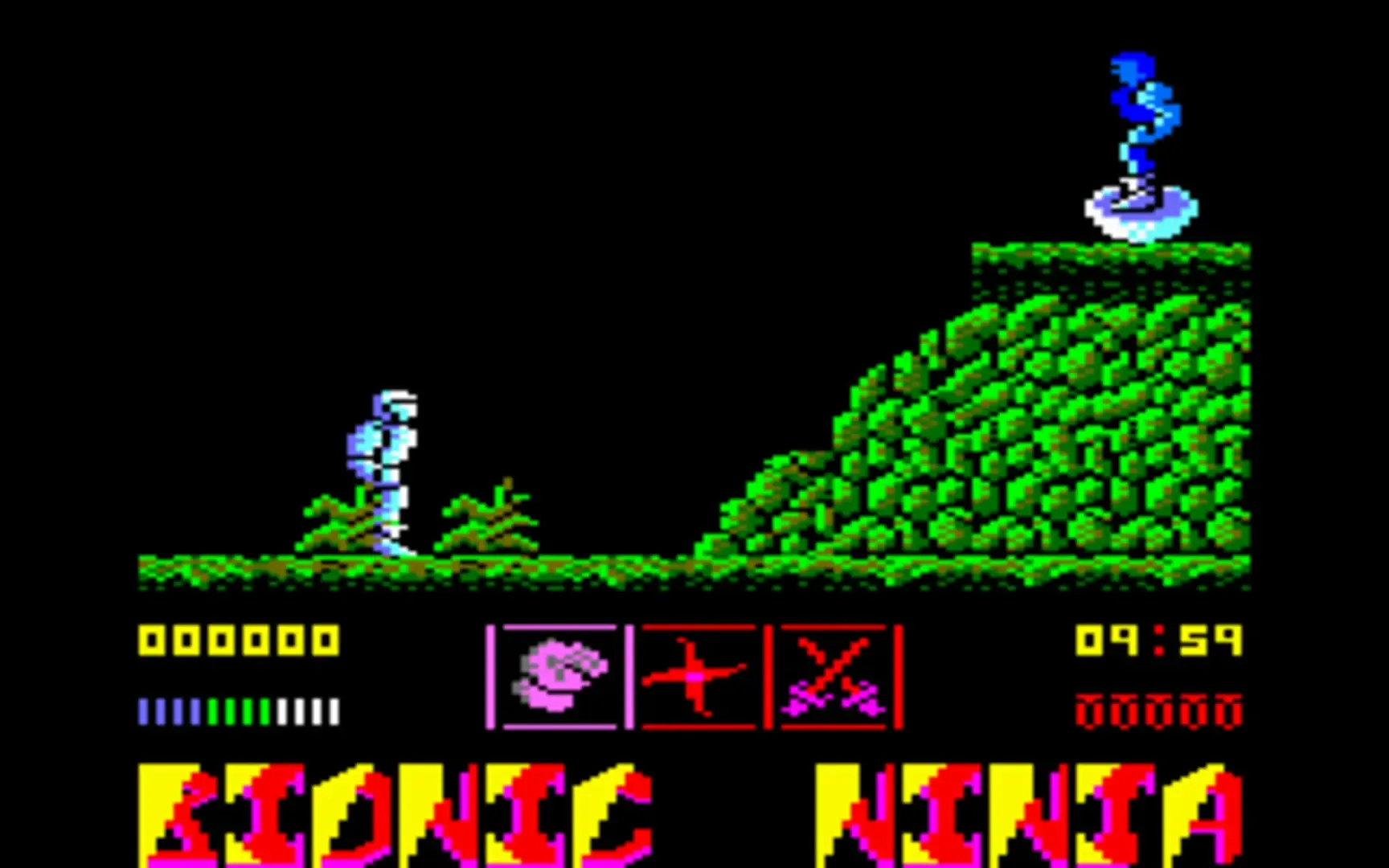 Aliens are attacking Icarus Earth Defence Base and within a hour and a half will occupy it, bringing bad news for the occupants of our planet. The solution is to send a android installed with the Oriental Disciplines of the East and destroy all the aliens over five levels to save Earth. You play the role of Bionic Ninja and you must use various martial arts as well as shruiken's and swords, to destroy or avoid the various occupants of the base. You are able to switch between any of the three attacking options by pressing the space bar at any time. If you are touched or shot by any of the enemy then you lose part of a power bar and if it empties then you lose one of five lives but extra power can be collected on the way. Each level is split into two sections and they must be completed within a time limit or it is game over.