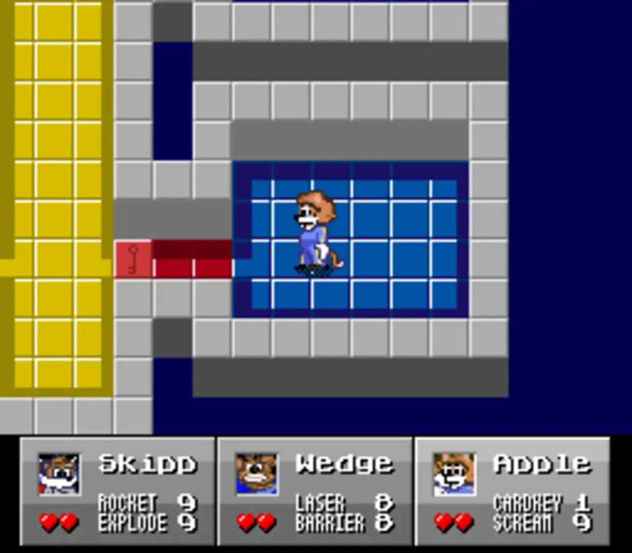 Skipp and Friends: Unexpected Journey is a SNES homebrew (action-puzzle) game that was developed by Mukunda Johnson for the PDRoms Coding Competition (v4.01) in 2009. It came in 1st place out of 8 entries, but the original winning game was not made to work on an actual console. Piko Interactive later reaching out to Mukunda, and he agreed to fix the game and get it to work on the console. It then was released as part of Super 4 in 1 Multicart on December 14th, 2013. The objective of this game is to move all three characters to the EXIT in each level. Each character has 2 limited special abilities that you must use to solve a variety of puzzles. The in-game status bar displays the name of each ability and how many times it can be used during that level.
