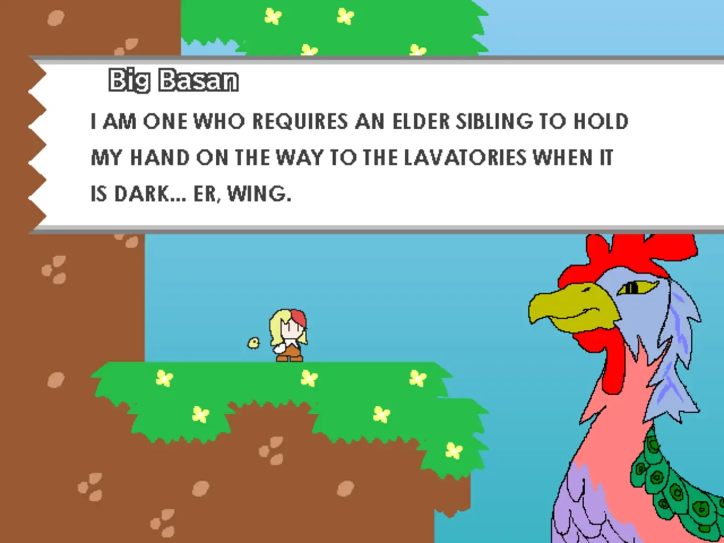 Something stirs in the early morning... An ethereal crowing is heard... It's a really big chicken that wants its egg back, but is just too afraid to do anything by itself. It's up to Kutaka to save the day, dashing, fluttering, and PUNCHING her way through obstacles and rival myth-birds!