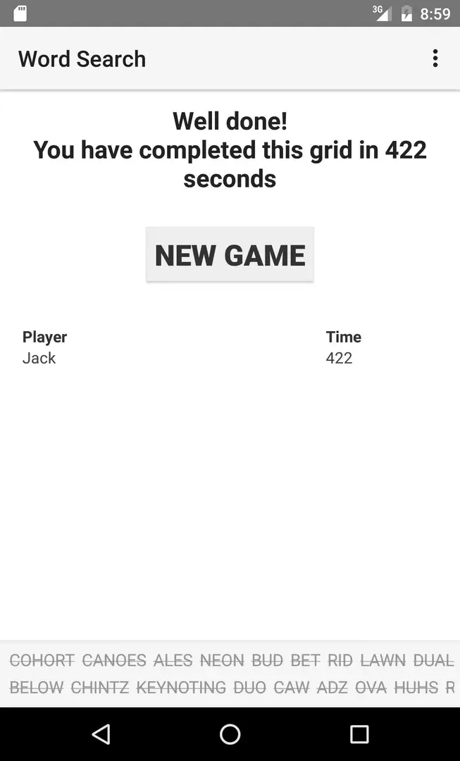 Word search game played on a grid of letters.