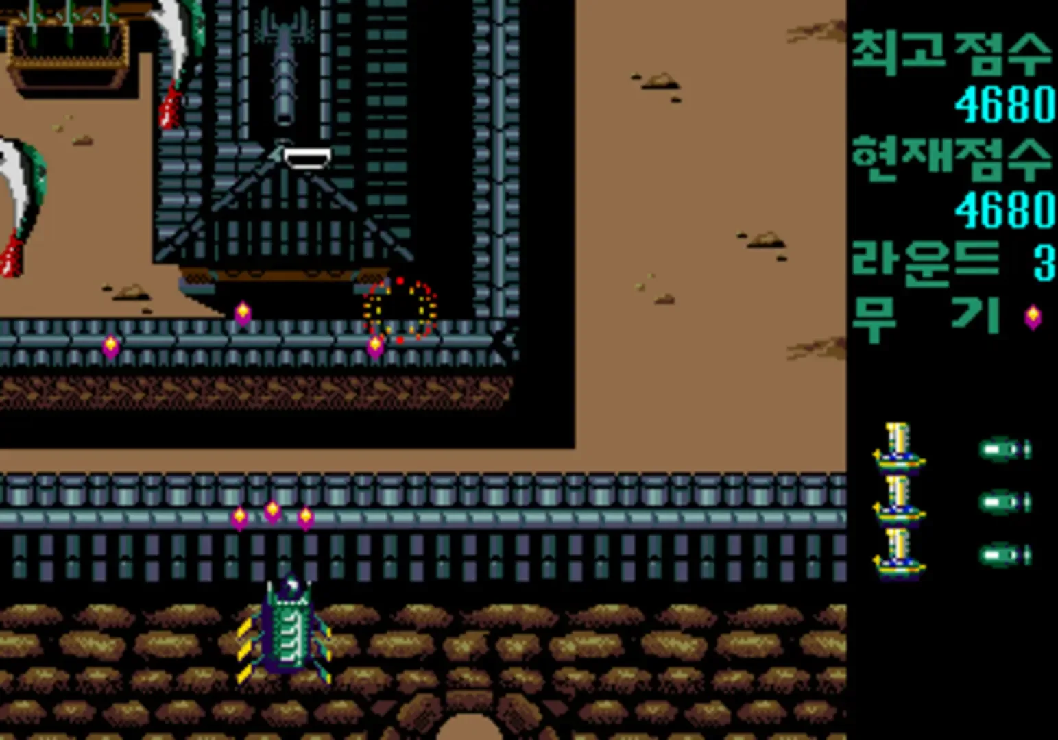 Uzu Keobukseon is a vertical scrolling shooter, released only in Korea. Players controlled the title ship, a purple and gold space-age battle cruiser designed as a turtle ship, complete with sails and oars, in eight various stages.