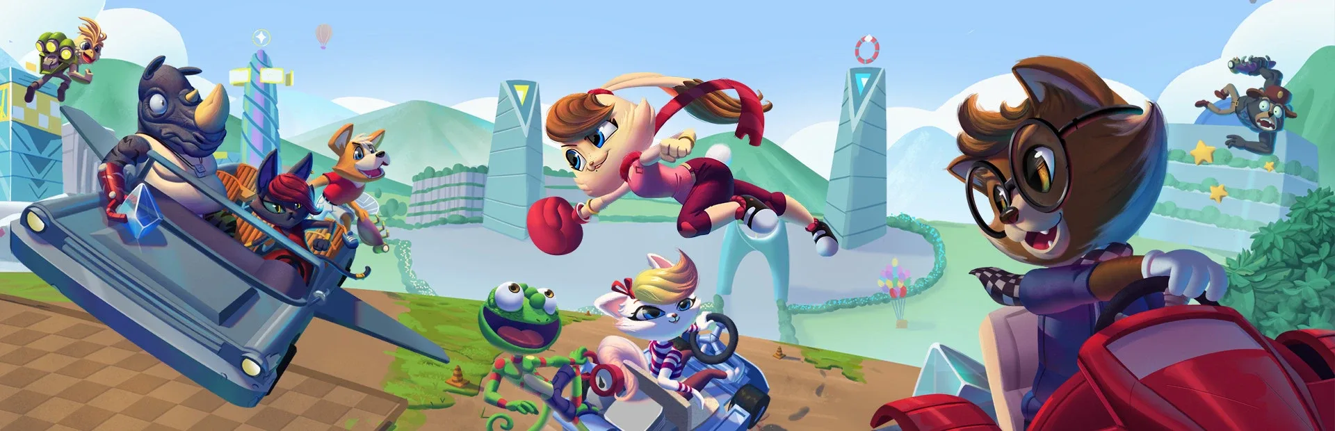 Dash, bash, and race through a vibrant party game packed with dynamic tracks and arenas! Compete in Cups as you ride karts, blast off with jetpacks, and snatch power-ups in action-packed modes like Triathlon Races, Crystal Captures, Battle Royale, and Classic Battles - solo, splitscreen, or online.