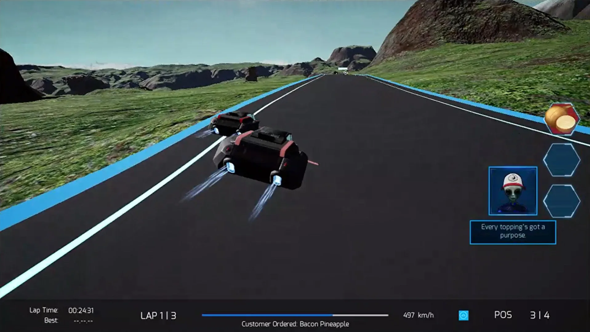 Compete against the galaxy’s finest pizza delivery wannabes in this high-speed thrill ride! Challenge your friendships and sabotage your friends in two-person, head-to-head local races that put your piloting skills to the test in . . . The Cygnus Pizza Race!